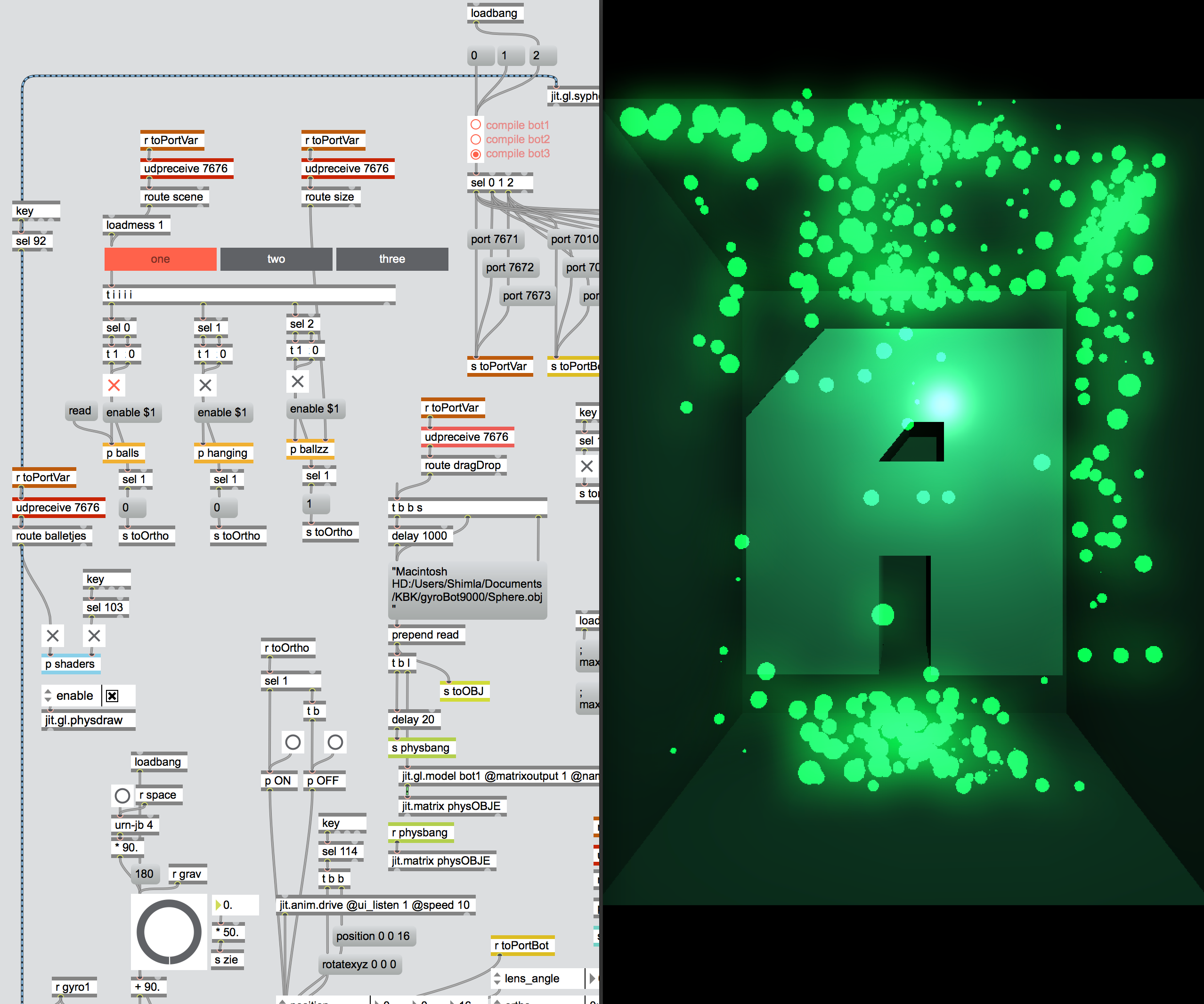 He approached our MaxMSP specialist Sem, who took the idea further and wrote a patch that translated the Phone’s tilt information to x/y/z rotation in 3d space and transmitted that to a laptop running Max in the front of house.