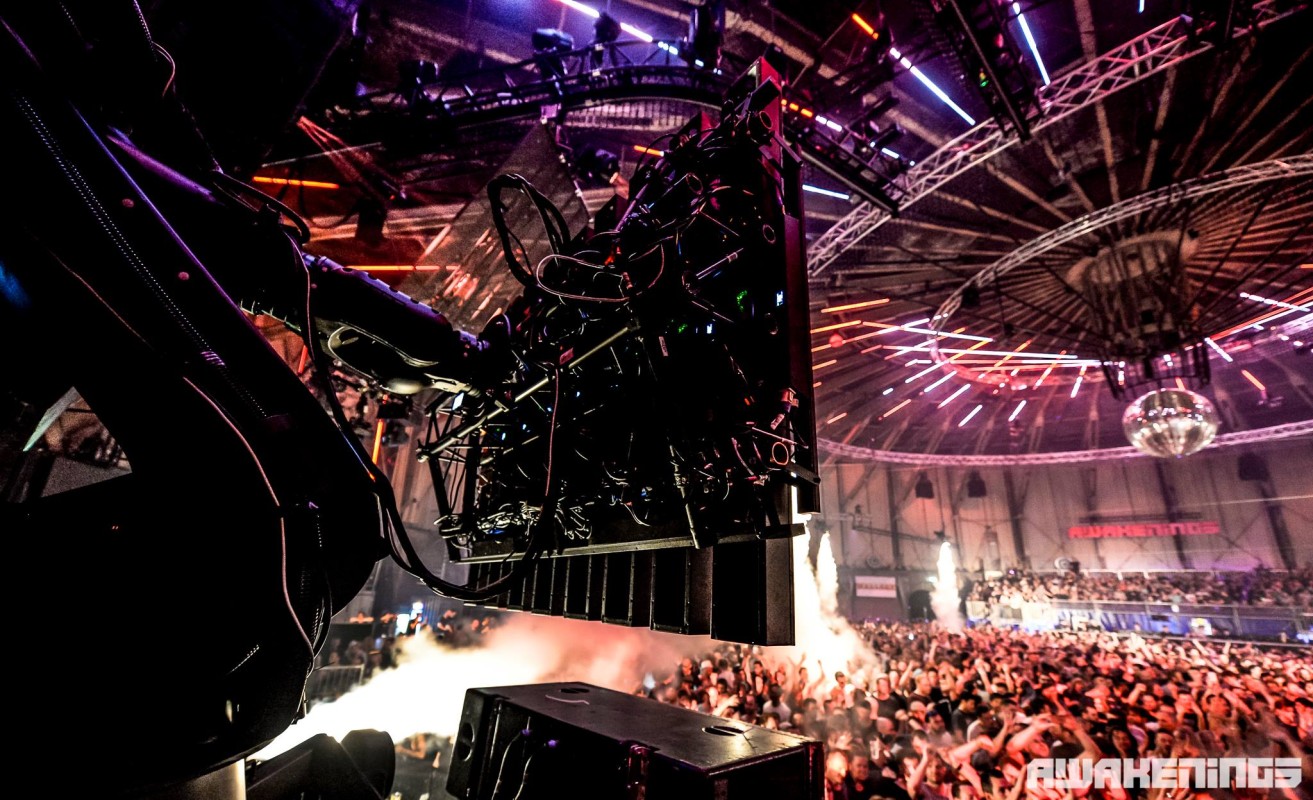 The Gashouder is a beautiful venue in and of itself. With its origins as a gasworks it’s easily recognizable by its circular shape, tall ceiling and industrial appearance. The fact that it’s cylindrical allows for stage designers to go nuts, and especially during Awakenings a lot of thought is put into creating an experience that is as breathtaking and immersive as possible. They never shy away from complex and often massive LED setups. Whenever a new edition comes along we try to pay as much attention as we can to our relation to the lights and lasers, so we can create show that works aesthetically as well as melting faces.