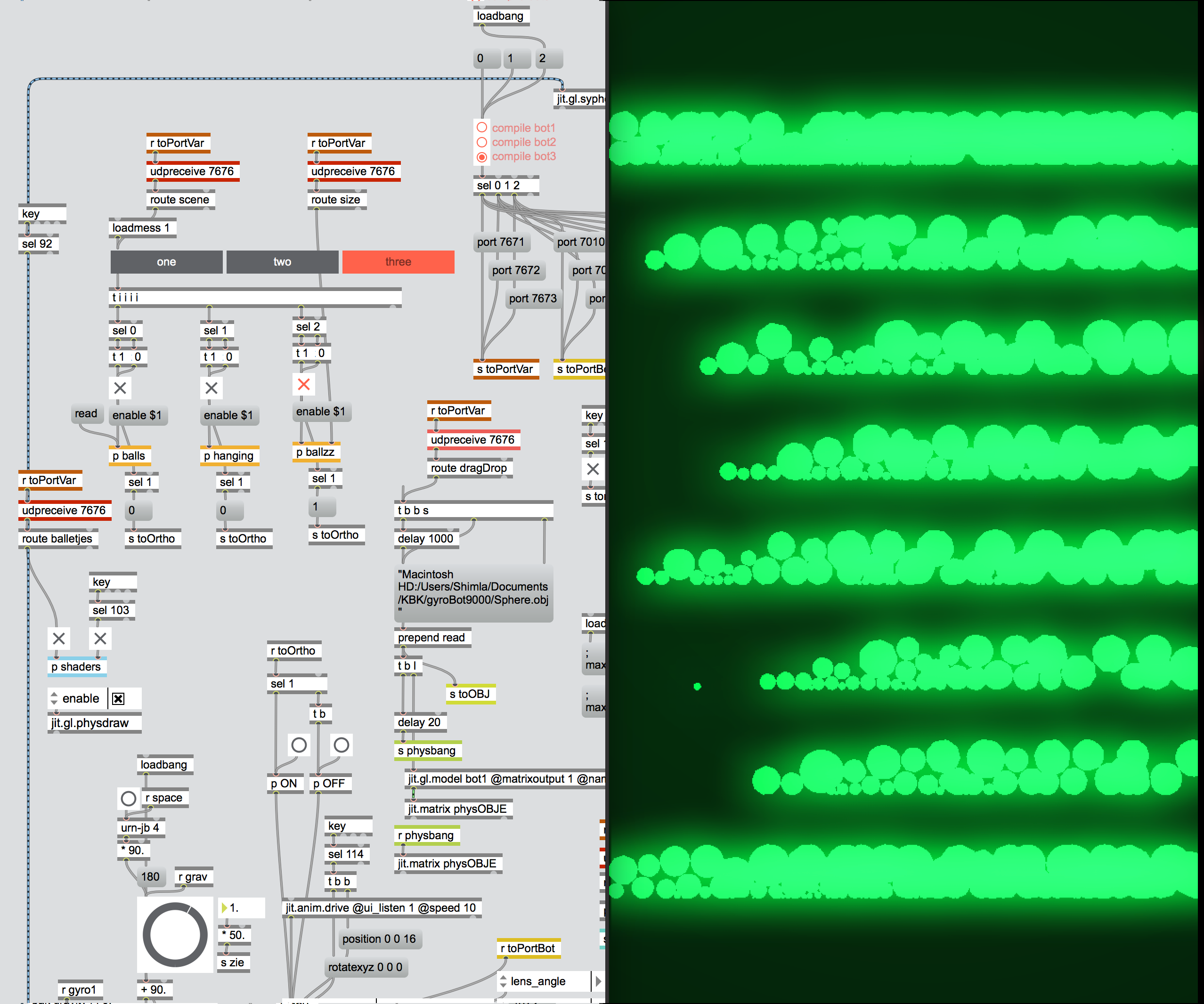 For those of you who want to dig a bit deeper into this, here is a bit of technical gebabble, as described by KBK, “The software that’s generating the live rendered physics was built with Max 7. Each of the three robo screens has its own compiled version of a patch that renders the physics in real time, based on the angle of the iPhones. Each patch now has 3 scenes and individual parameters like color selection of the lights and size of the objects. Every patch has a spout output and there is one patch combining all three Spout outputs to be sent to the main Resolume computer via TCPSpout. There it’s imported as a Spout input and scaled to fit the composition. All the apps are connected over a local network via UDP. This way it’s also possible to control all the individual apps with one controller on another computer. The laptop running the apps was tucked away so this came in very handy. There’s one central control app (called OSCBOT) not only controlling the physics renders but also controlling Resolume dashboard links with the angles from the iPhones. This way we can rotate visuals in the opposite direction to the rotation of the robot arms so it looks like the visuals are standing still while the robots are moving.”