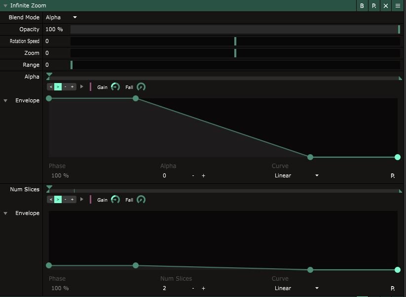 Infinite Zoom => Playing with the Alpha cursor allows you to make the clip disappear / appear. In addition to this, the "Num Slice" slider allows you to add an effect similar to Exposure (between 2 and 4 slices). At the beginning of the sequence, this makes the clip more "powerful".