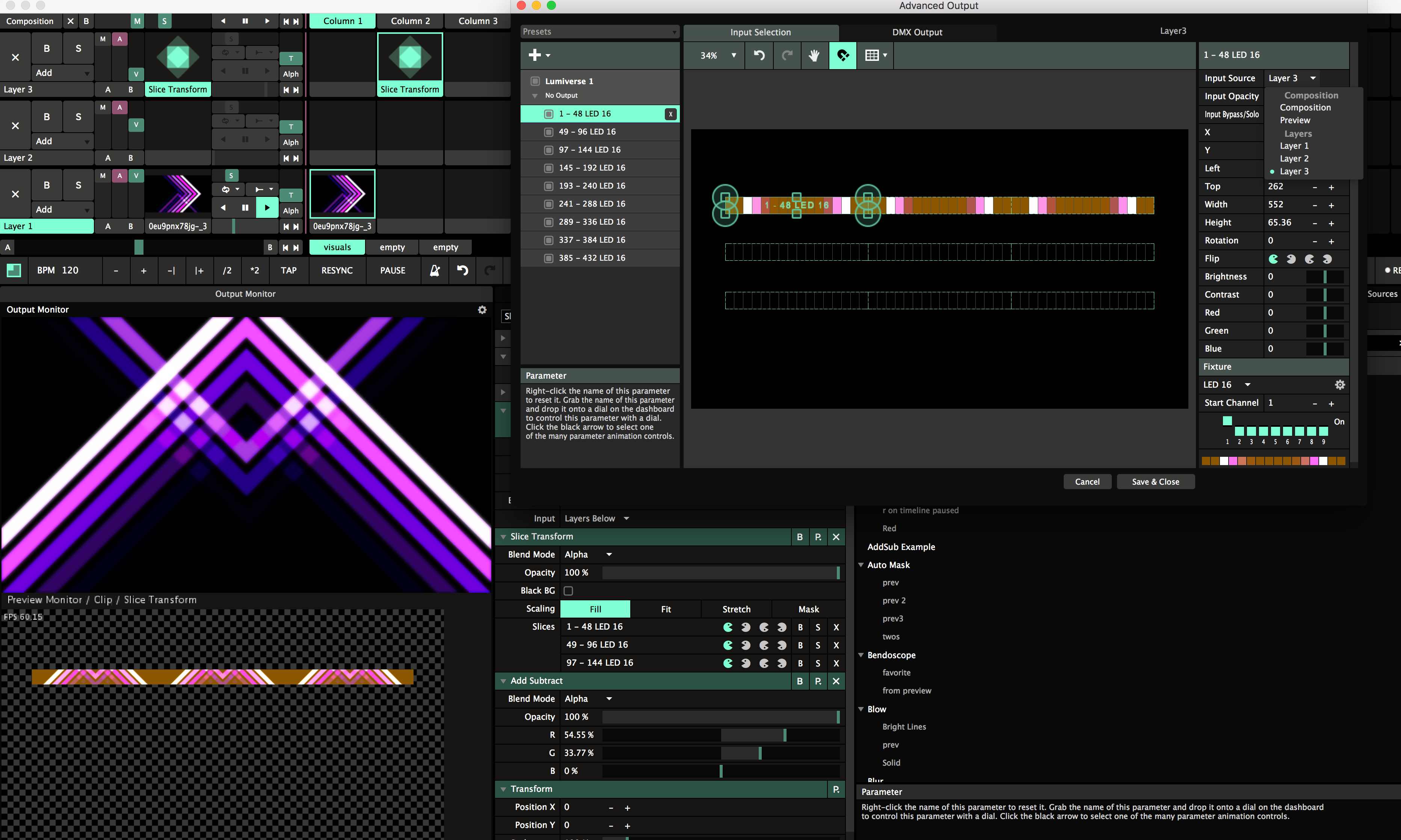 Slice transform effect clip on a layer with the fixtures could help https://resolume.com/support/en/transfo ... -transform