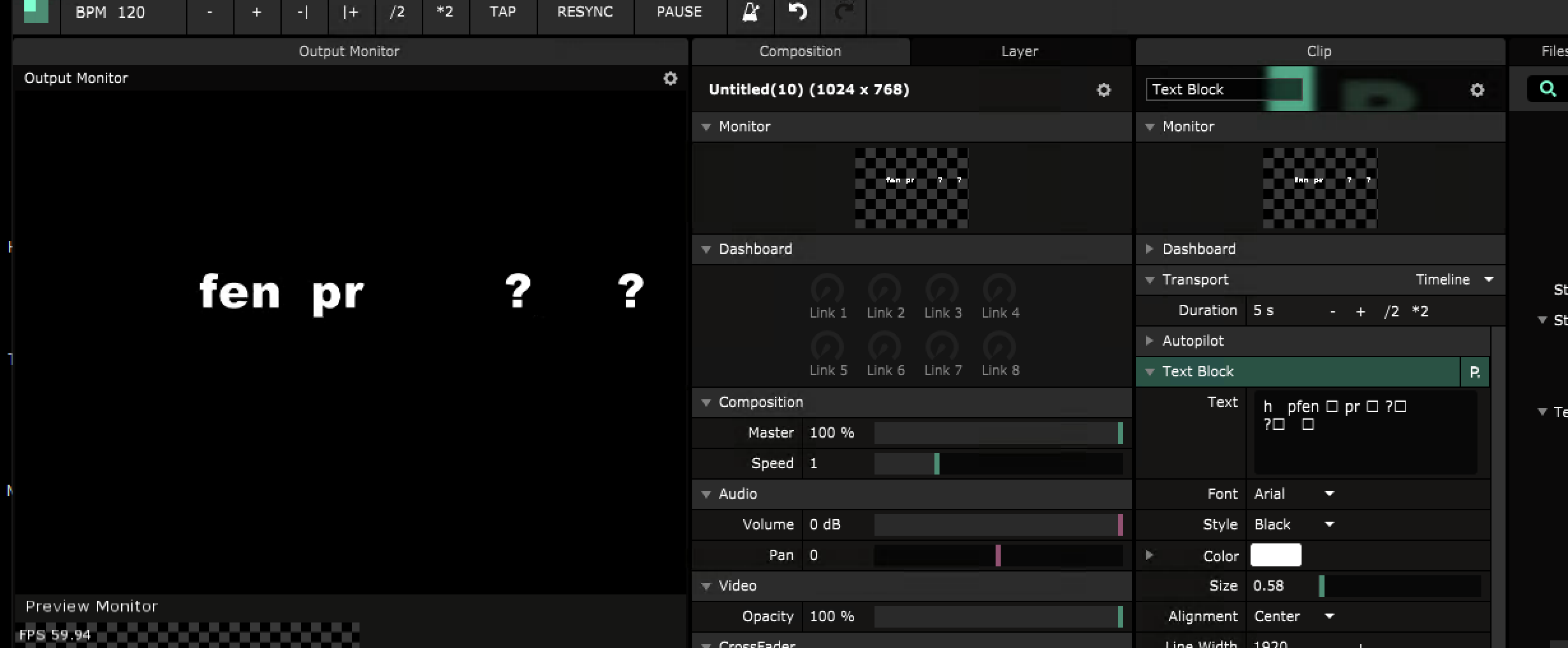 Do these characters show up with your selected font, if you type them into the text block in Resolume directly?