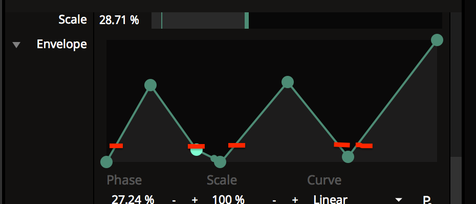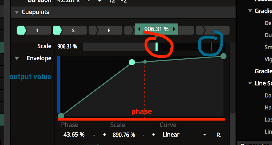 In this shot, the param slider is at 50%, the small dot in the envelope is at 50% horizontal, the envelope says it needs to be at 90% vertical. This vertical position is your output value for the parameter.