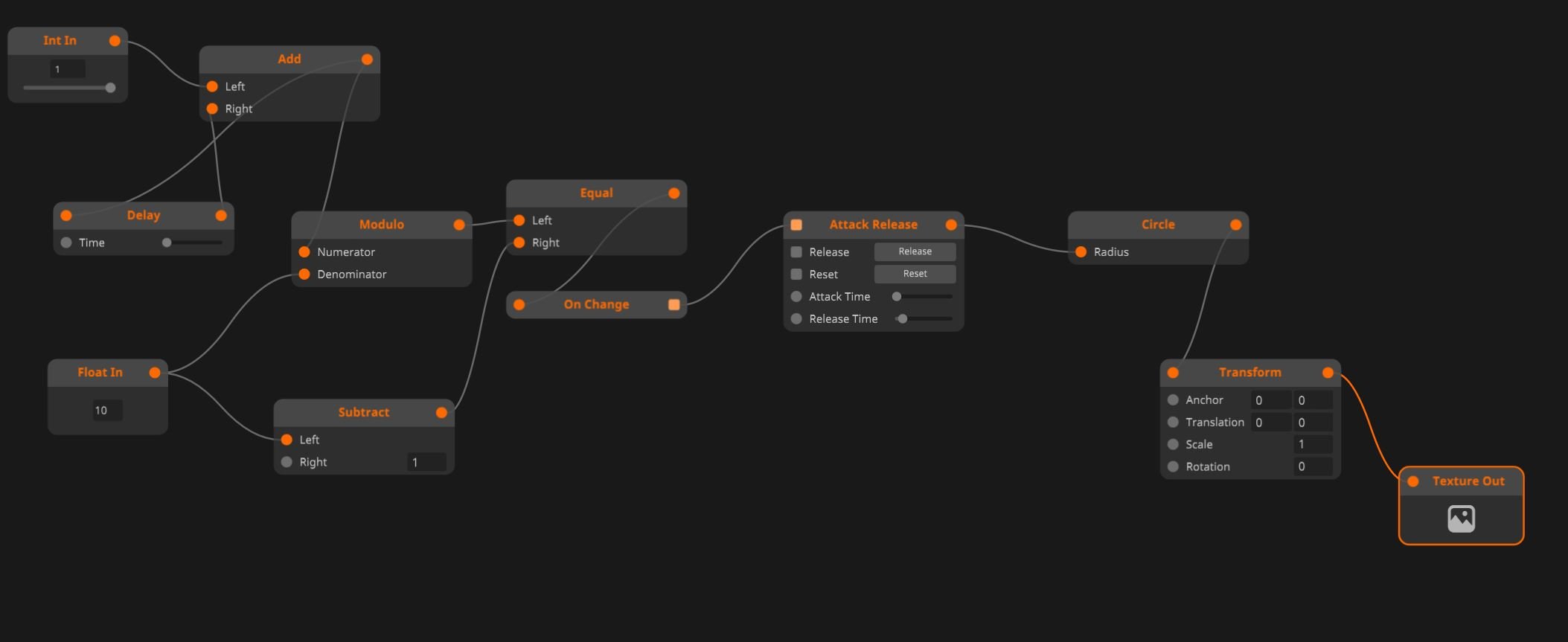 If you hover your mouse over the outlet of the Onchange node, you can see it switches to True, then to False quickly. Those are two triggers, so it starts the Attack-release twice quickly.