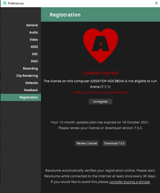 Re: Restore Resolume Arena 7.7.1 to 7.5.0