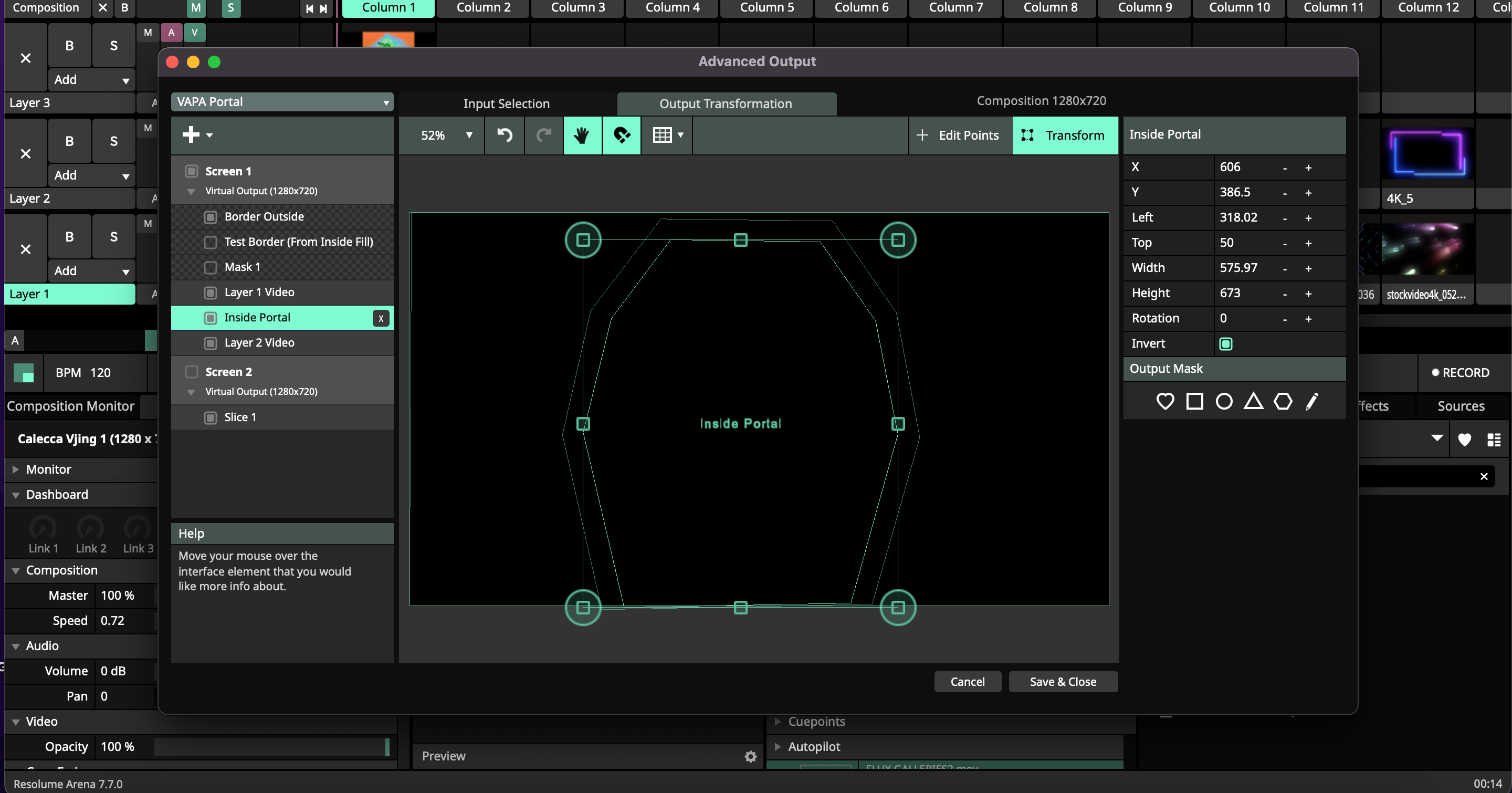 I've been creating different sizes and types of output masks with screen 1 being the smaller mask and linking itself to Layer 1 while screen 2 is masked to the edge of the border around the octagon and is linked to Layer 2. I just can't seem to find a layer/mask order that allows you to see each video distinctly separate from one another. Do I need to adjust Input Masks? What simple thing am I doing wrong here?