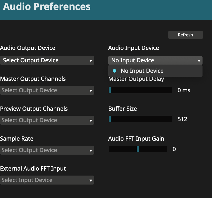 The audio input and FFT input boxes show no options - not even the built-in mic.