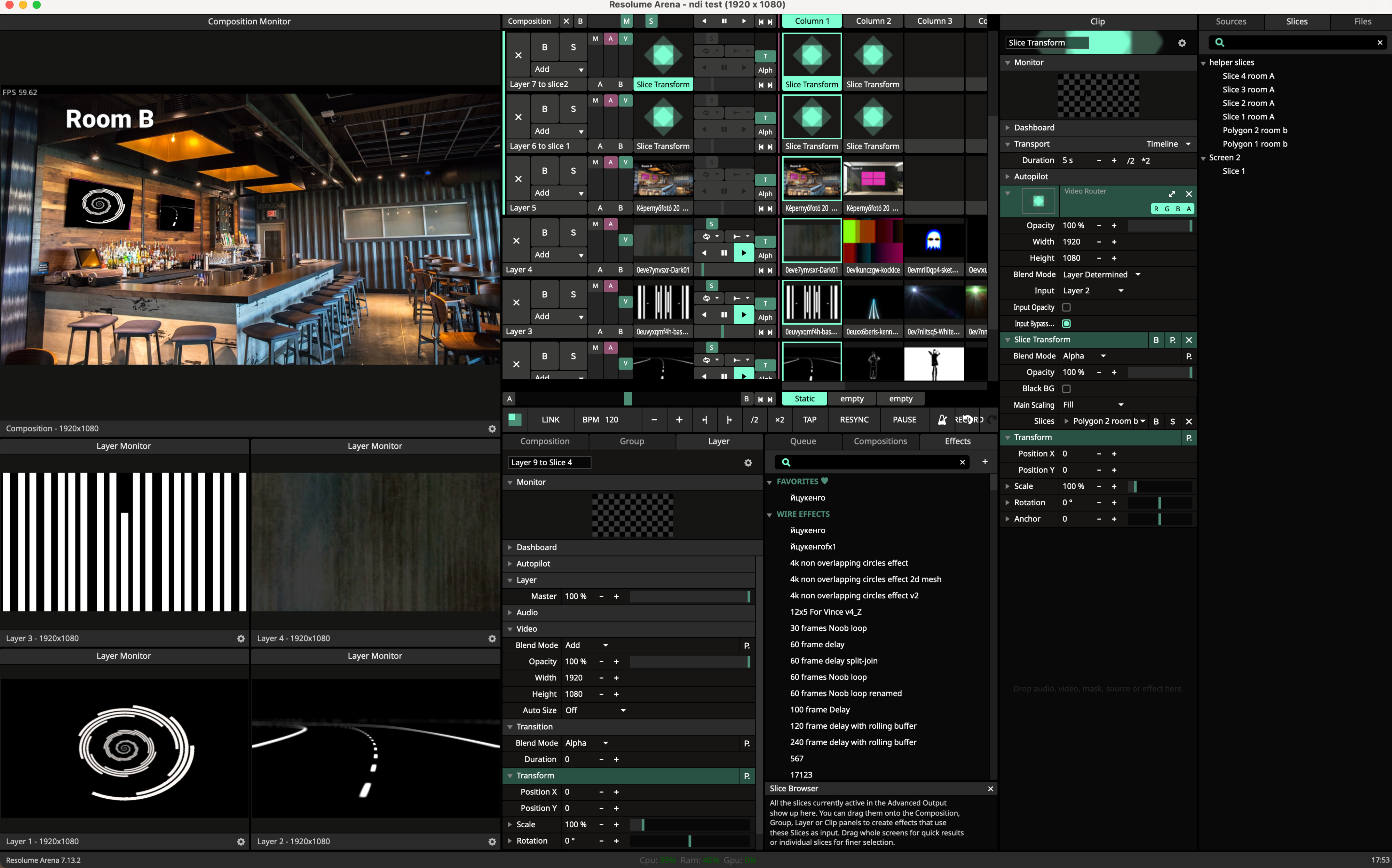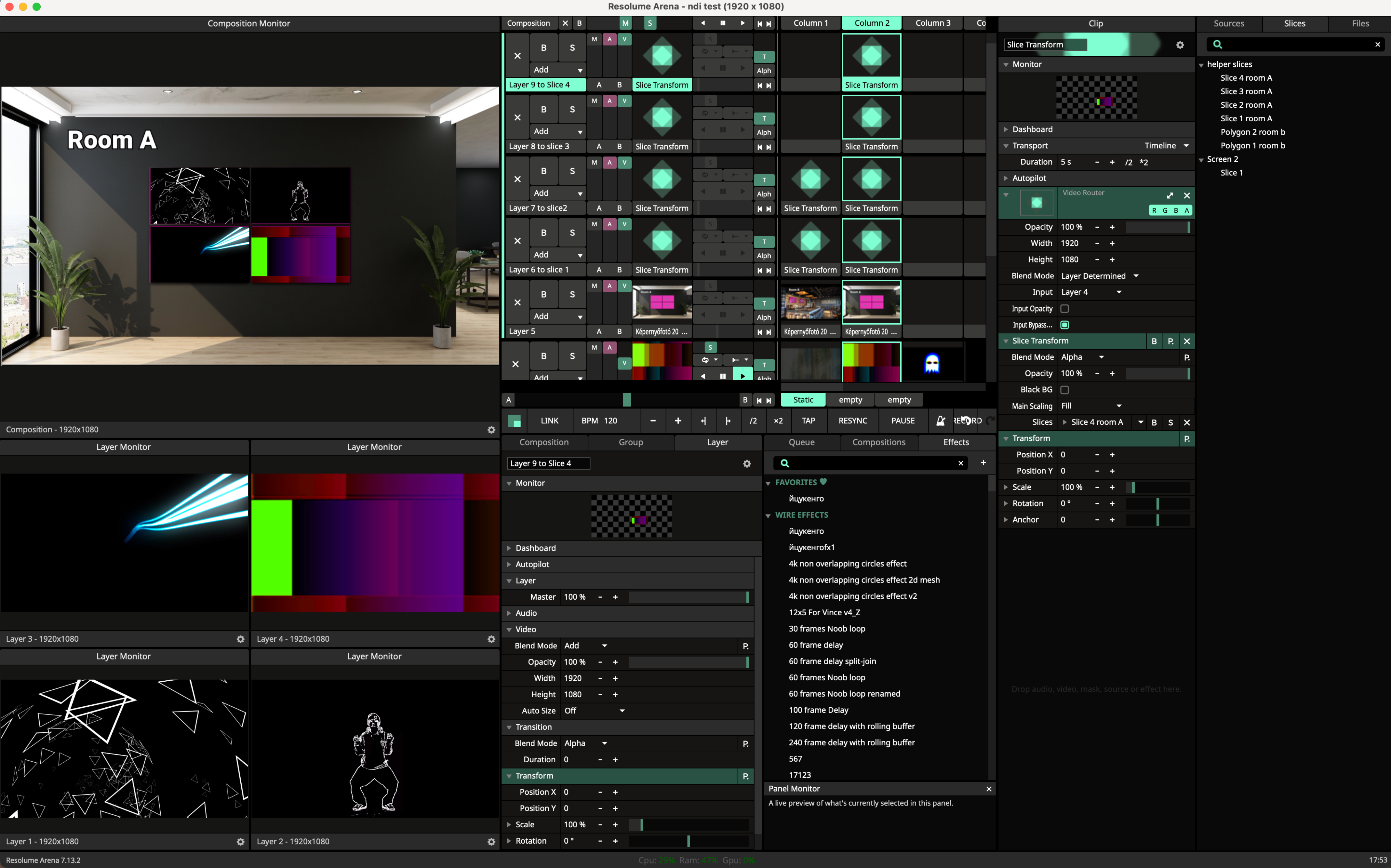 Hmm, yeah, StageFlow can give the perspective then for the slices, but you can get pretty close natively toocedricchase wrote: Thu Nov 10, 2022 21:25 Just to be clear, these 'rooms' are virtual, like literally I'm playing videos on the displays in the image, and I would like to quickly switch from the 'bar' image and displays, to the 'video wall' image...