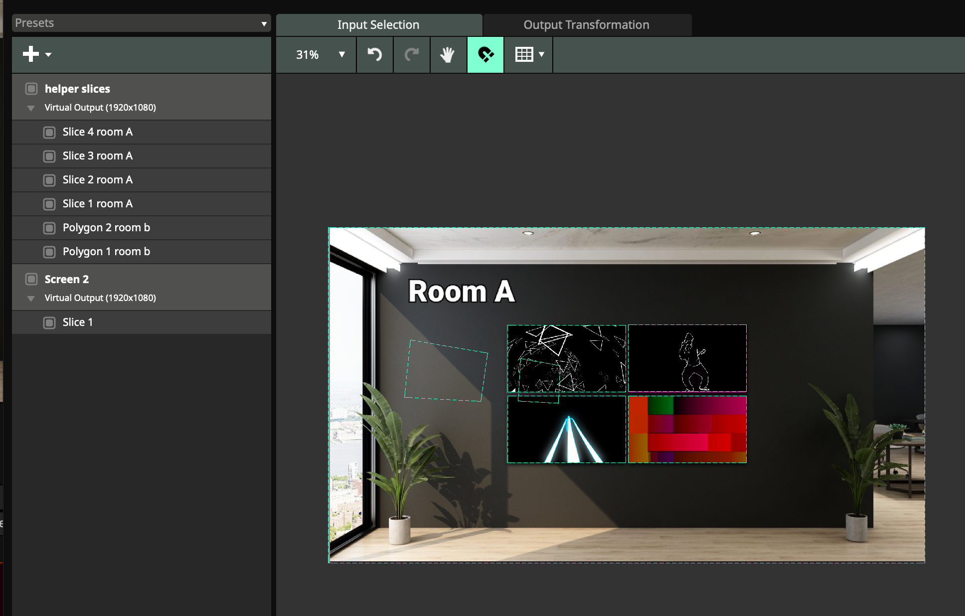 I am displaying various rooms with televisions in various positions and angles. The rooms are PNG's with transparent areas where the screens are. Underneath this room layer, I have 4 Slices displaying live feeds from 4x HDMI input cards - all aligned to their respective display in the room.