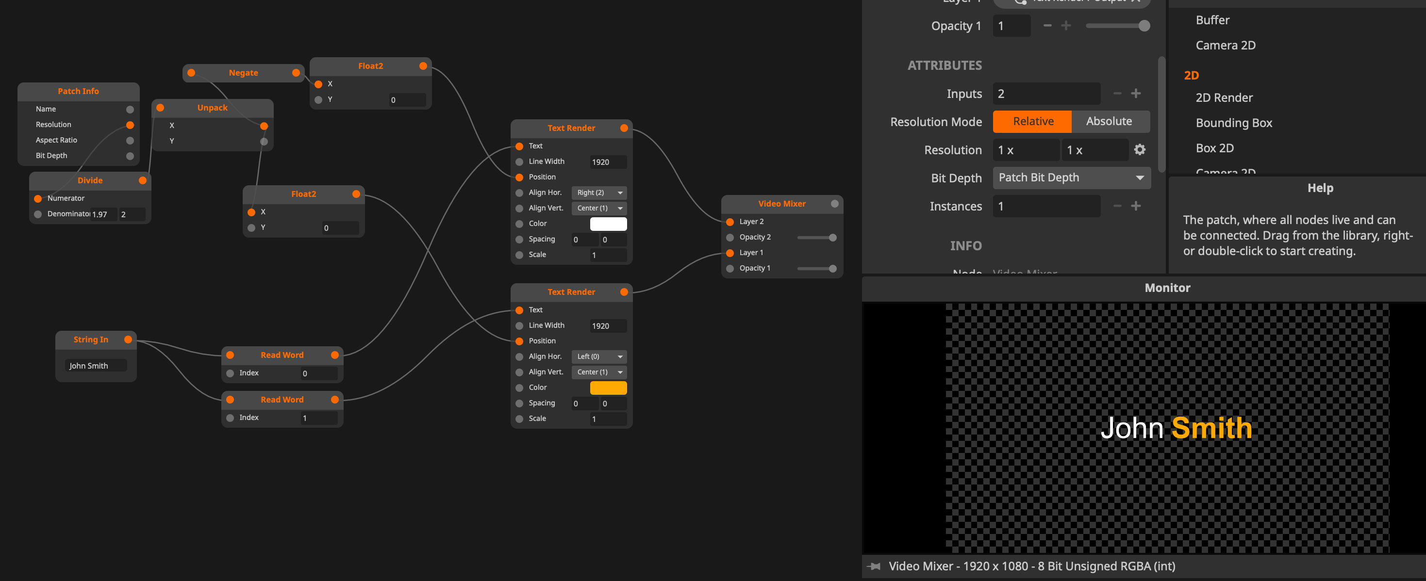 I need help making a simple setup in Resolume Wire. I want to show a first name and a last name, like "John Smith." The whole name should always be centered, no matter how many characters there are, and only the last name "Smith" should be in bold.