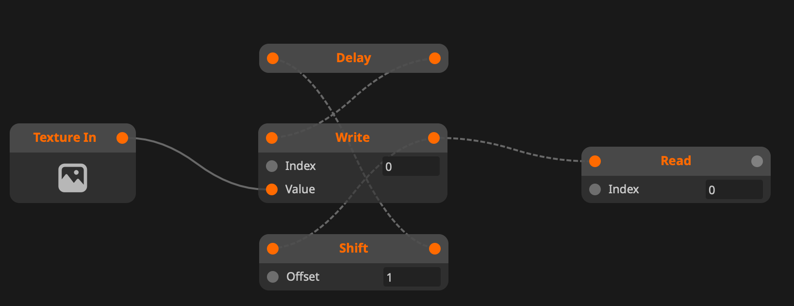 You can build your own texture buffer too, with write, shift, and delay. The buffer size can be set via the Delay instance count.