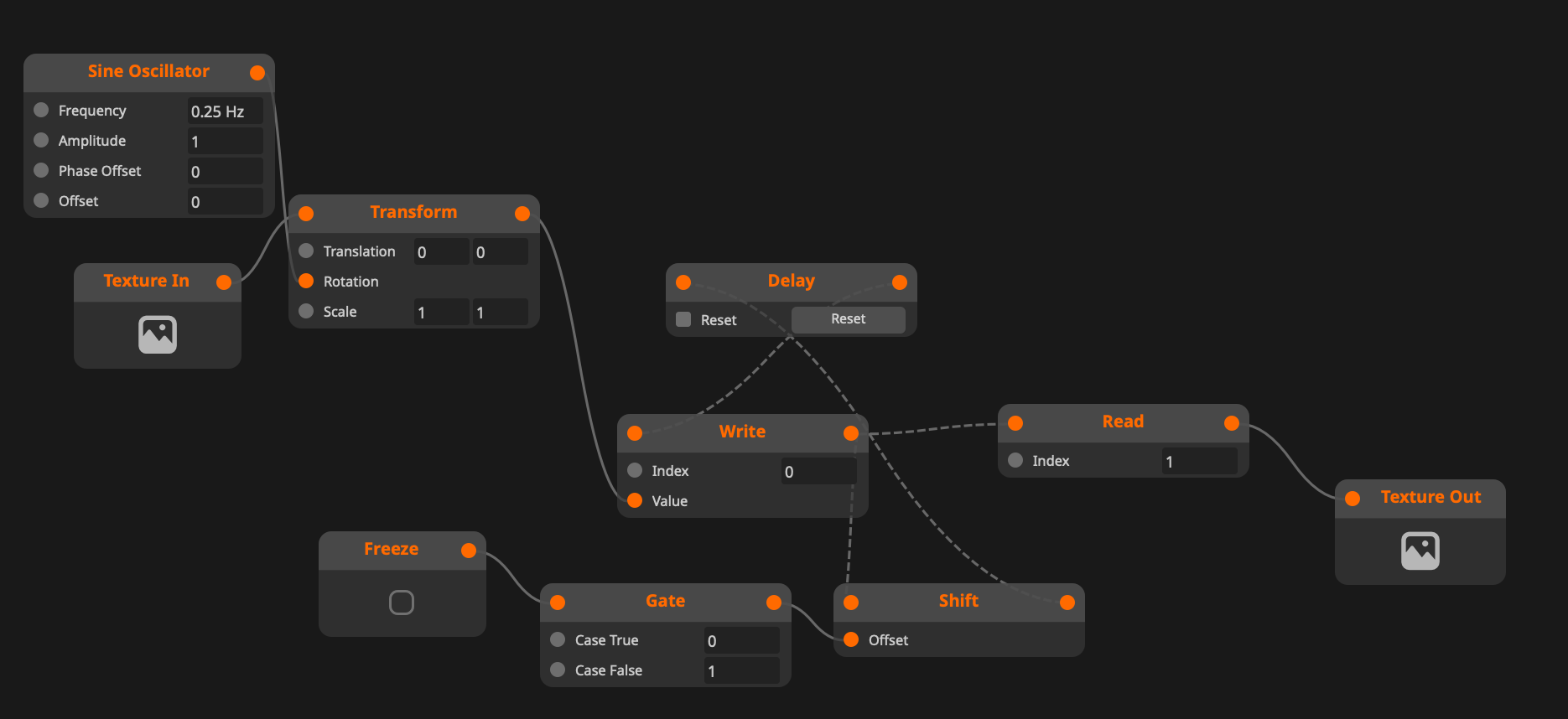 Then eithere shift the buffer or change which slot you write to, chaning the instance count of the delay node defines the buffer size.
