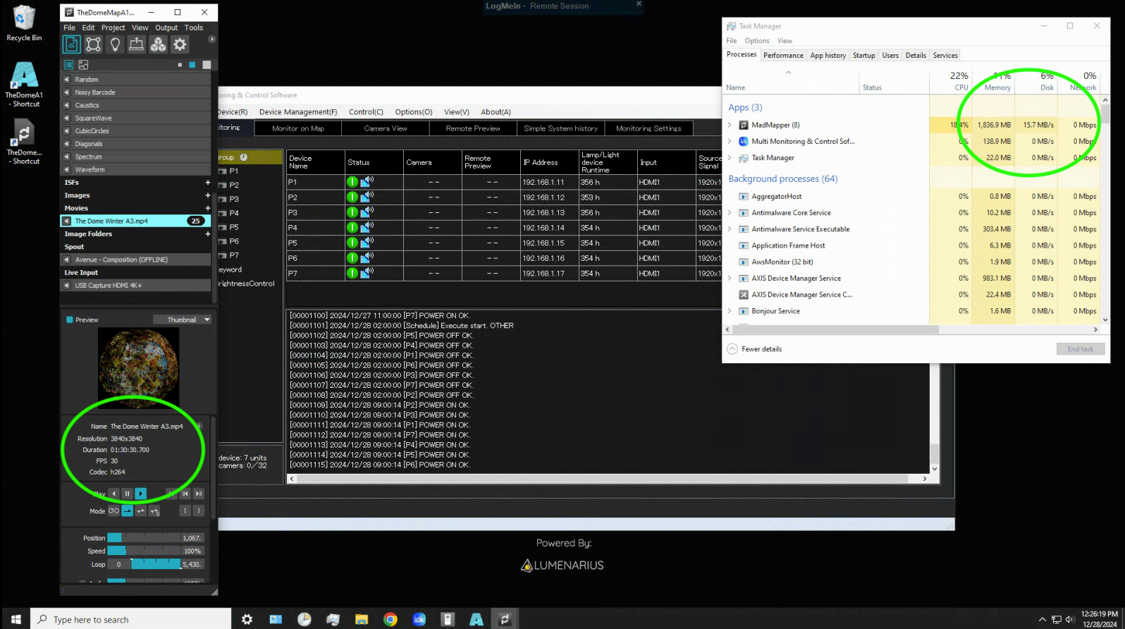 As for background tasks I have closed absolutely everything. The only other thing than MadMapper or Resolume is LogMeIn but the issue happens even if that is closed and the client is watching.