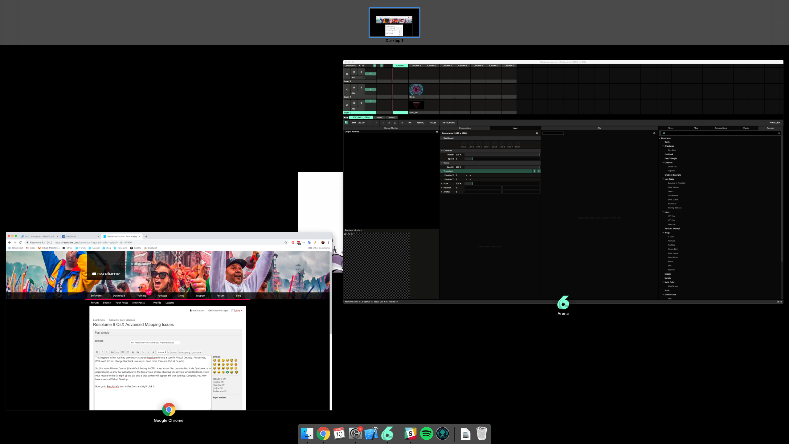 If you like, you can go back to Mission Control and delete the second Virtual Desktop you just created. Because you have Resolume assigned to use all Desktops when you deleted it, things will continue to work as expected.
