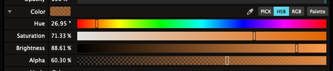 Wenn Sie eher ein Zahlentyp sind, können Sie die Farbe auch mit den RGB- oder HSB-Slidern einstellen. In diesen Modi kann man die gewünschte Farbe durch Eingabe der exakten Werte für Red, Green und Blue, oder Hue, Saturation und Brightness bestimmen. Slider bieten den zusätzlichen Vorteil der Parameter-Animation sowie einen speziellen Slider für den Alpha-Wert.