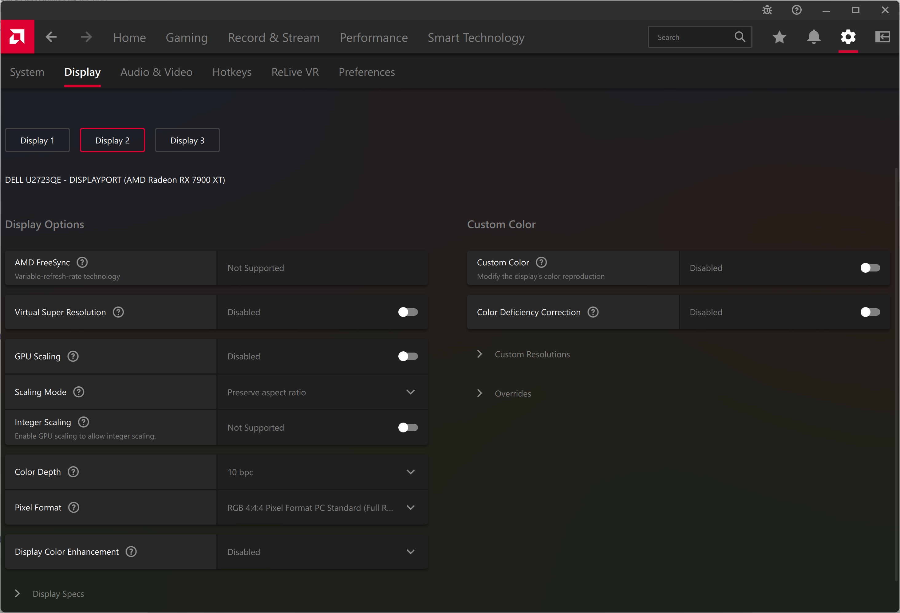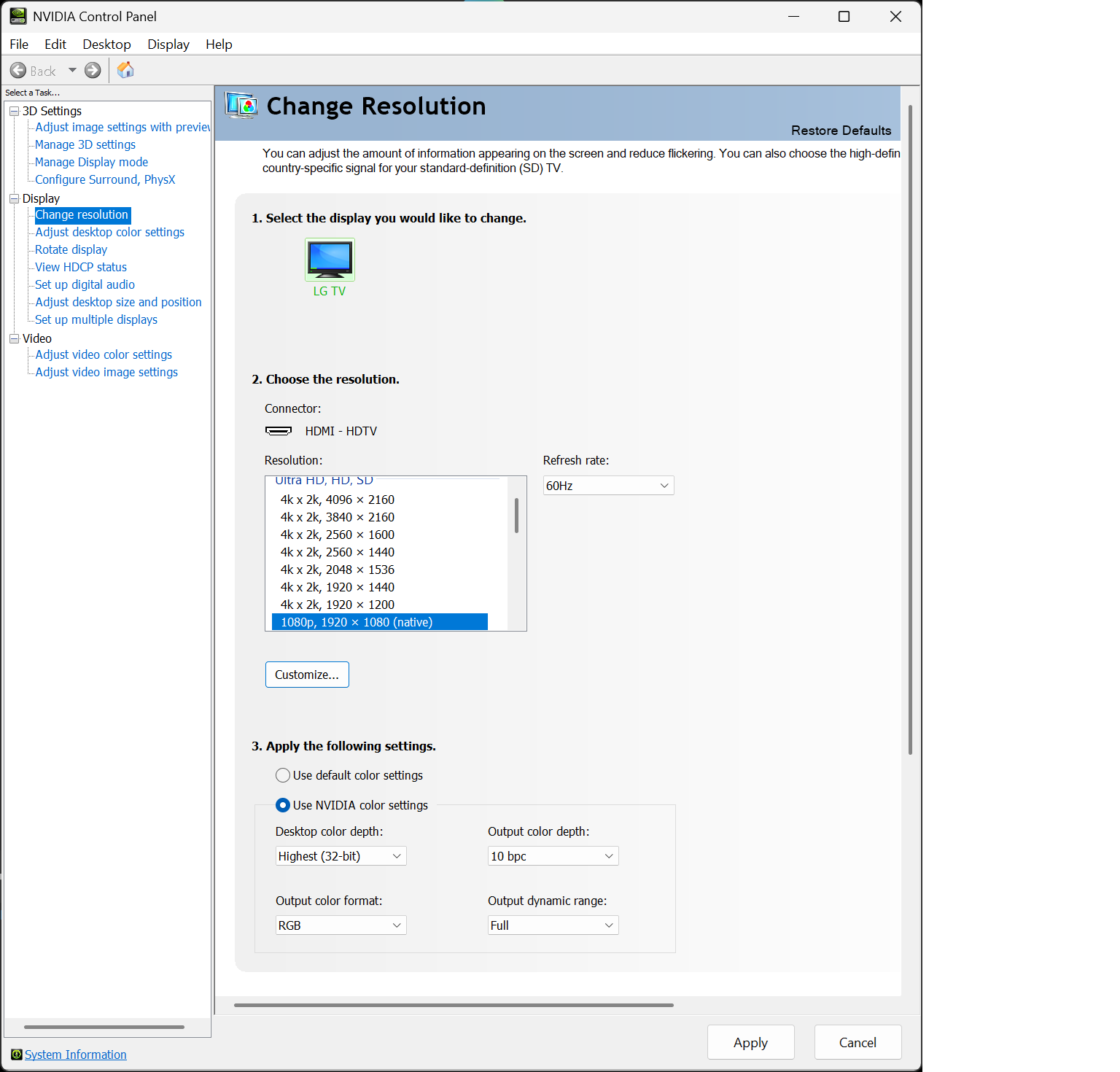 Desktop color depth: SDR (30-bit color) or Highest (32-bit) — not 24-bit.
