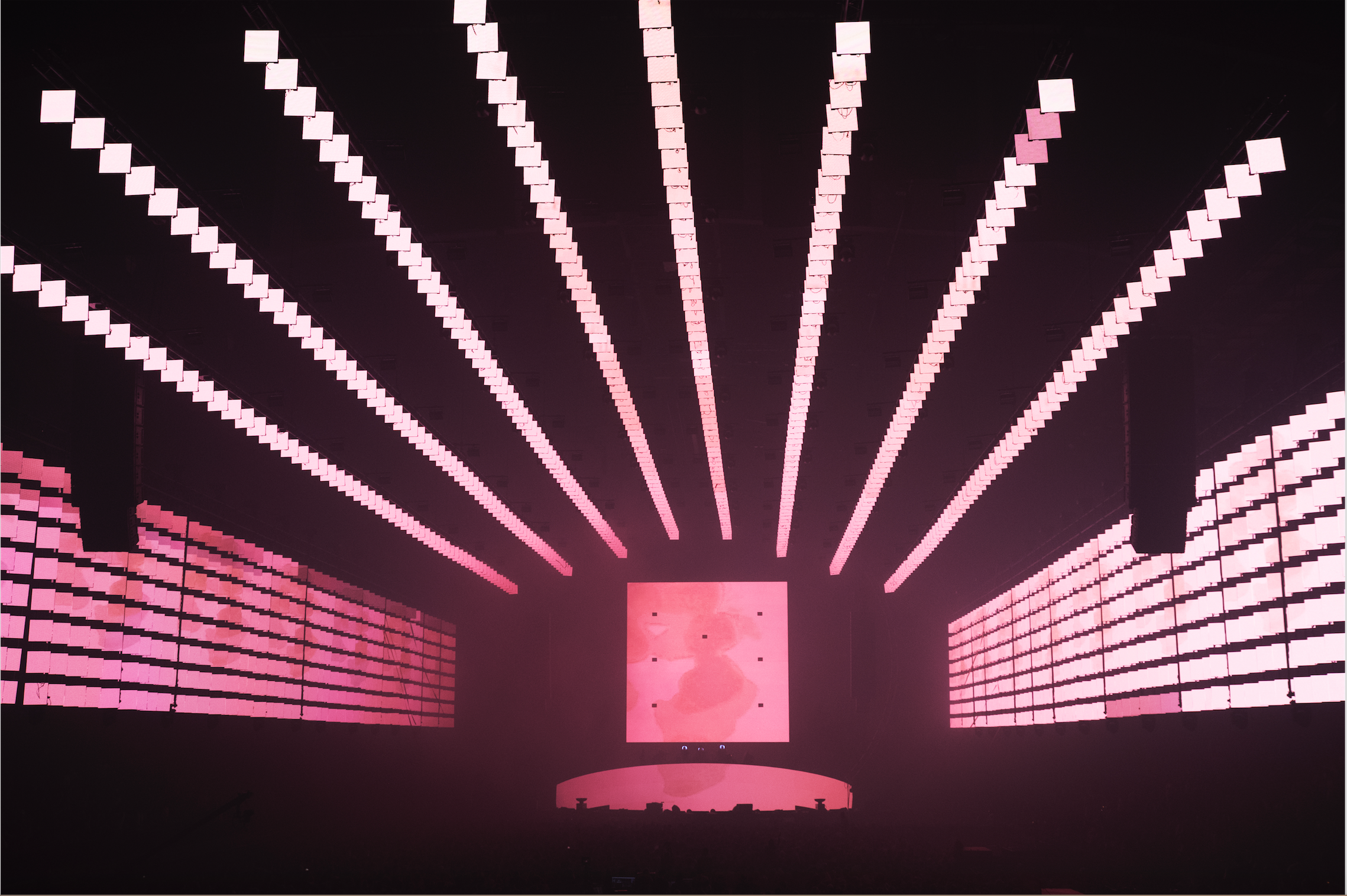 For the whole set design, we have used around 400 square meters of 7.9 mm LED. The LED tiles were split into 10 processors, of which 4 controlled the central circle screen. Most of the lower LED screens are stacked on a deck, the top circle is supported by the back scaffolding.