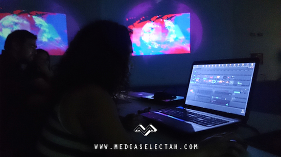With the support of Media Selectah, we opted to close the workshop with a video projection intervention in situ, where we designed a creative proposal and it was done on the same day. The place, was a big white closed room, used for conventions, we had 4 "little projectors" (2K lumens), but as always we did some magic using them to the maximum, and creating a smaller 3D video space within. Every participant developed their idea in a 3 minute performance, and then they all took part of a jam improvisation where random music was played and they would have to play vj.