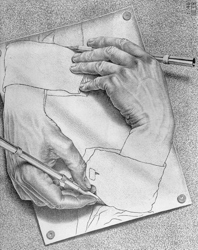 I always thought the name Strangeloop was a fitting title for my work, because I have, for as long as I can remember, been completely obsessed with fractals and 'strange loops' in chaotic systems. A "strange loop" is actually a technical term for a tangled hierchary, where you can move from one level of a hierachy to another and find yourself back where you started (kind of like the Escher drawing you see below). Its a really interesting paradox you find in all sorts of natural phenomena, including the most fundamental natural phenomena I can think of, perception.