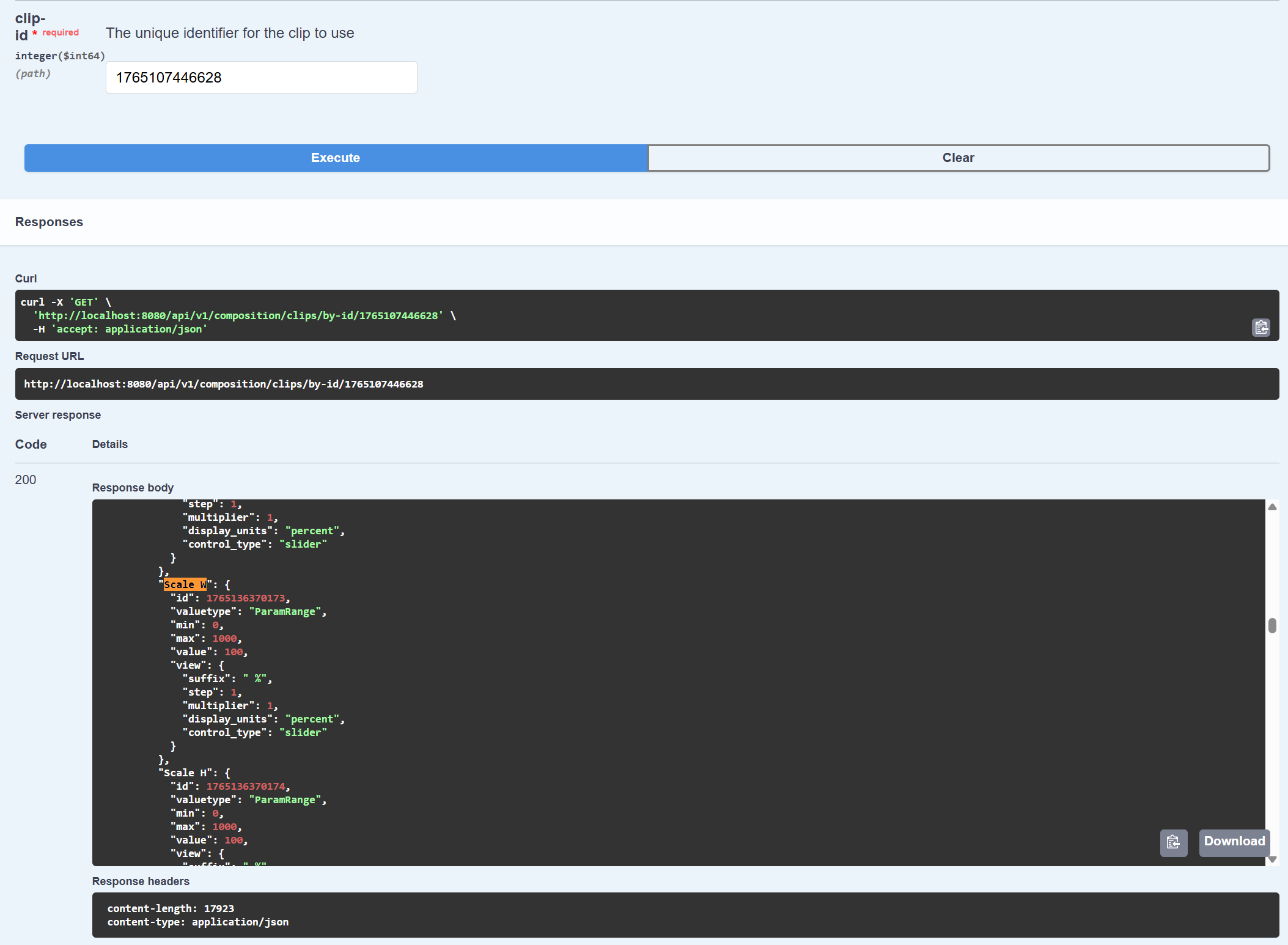 Using GET composition/clips/by-id/{id-number}, gets it correctly, but if I put the same number using GET parameter/by-id/{parameter-id} I get: