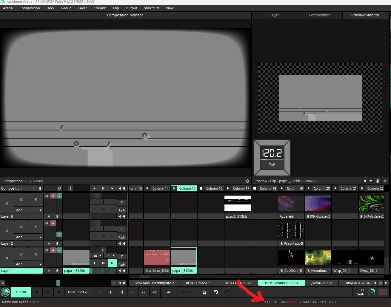 Stat reading: CPU 0%, RAM 85%, VRAM 13%, FPS 125,
