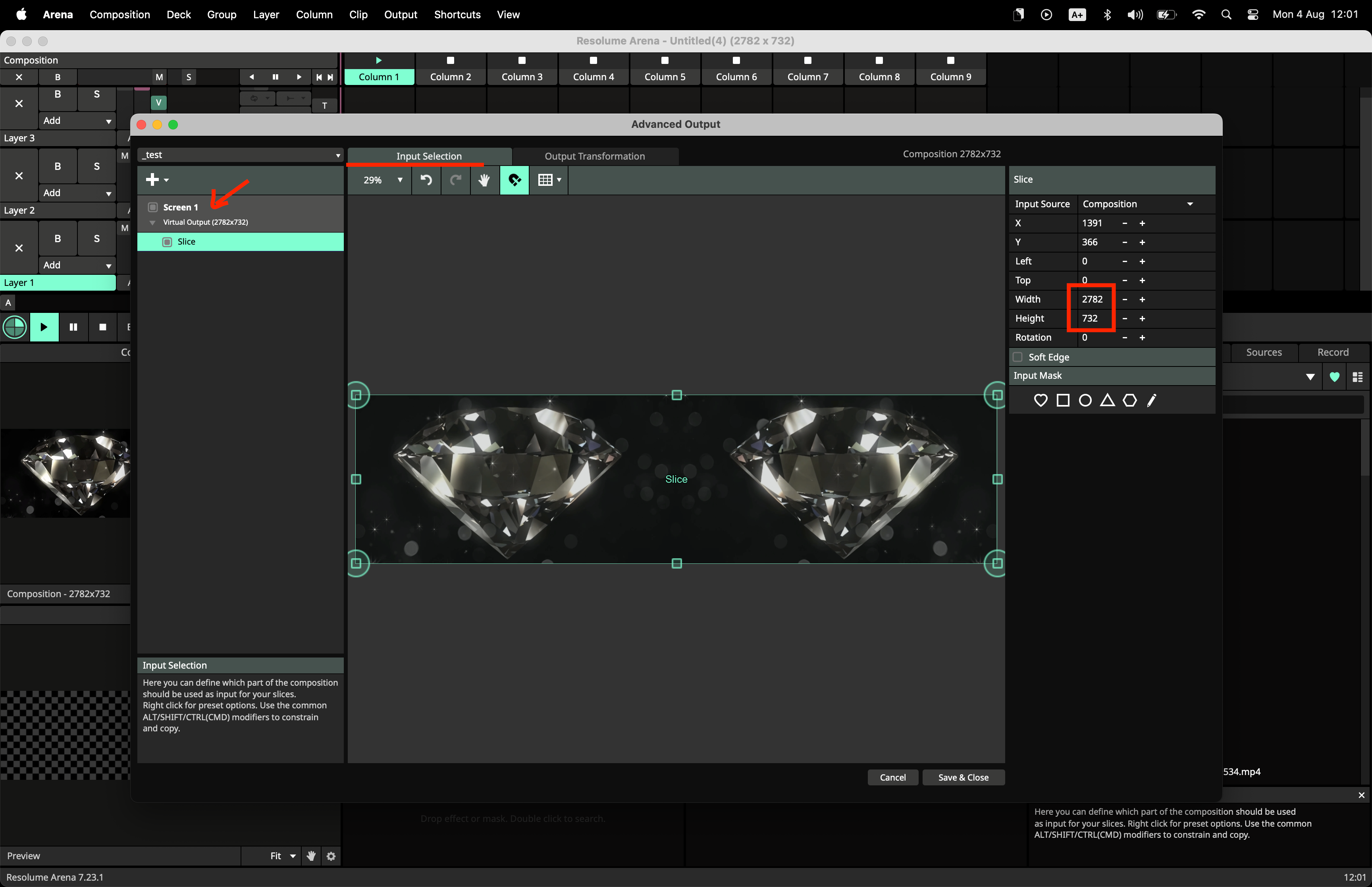 ok i've copied your image. that gives me a composition for the example of 2782x732. So i change my composition to that size. in the Advanced output make one screen and one slice. Make sure they have the same resolution as the composition, then go to the output tap, select "edit points", on the right side change the piont mode from linear to bezier. Now, all corners will get these extra bezier points that you can pick up so you can transform your output to fit your physical screen.. thats it you can now still play all you content "normally" only the output will be "warped" to fit you screen.