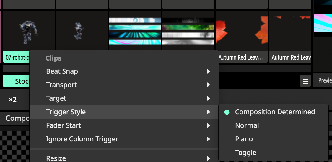 If you select those clips and you right-click or go to the clip menu there is a trigger style option that you can set to piano for clips. It's not done through the midi shotcut panel but through the clip settings.After assigning the three copies of Solid Color to three different MIDI notes, I am able to turn the clips on. But I cannot set the clip itself to piano mode so the clips will not turn off when I release the key.