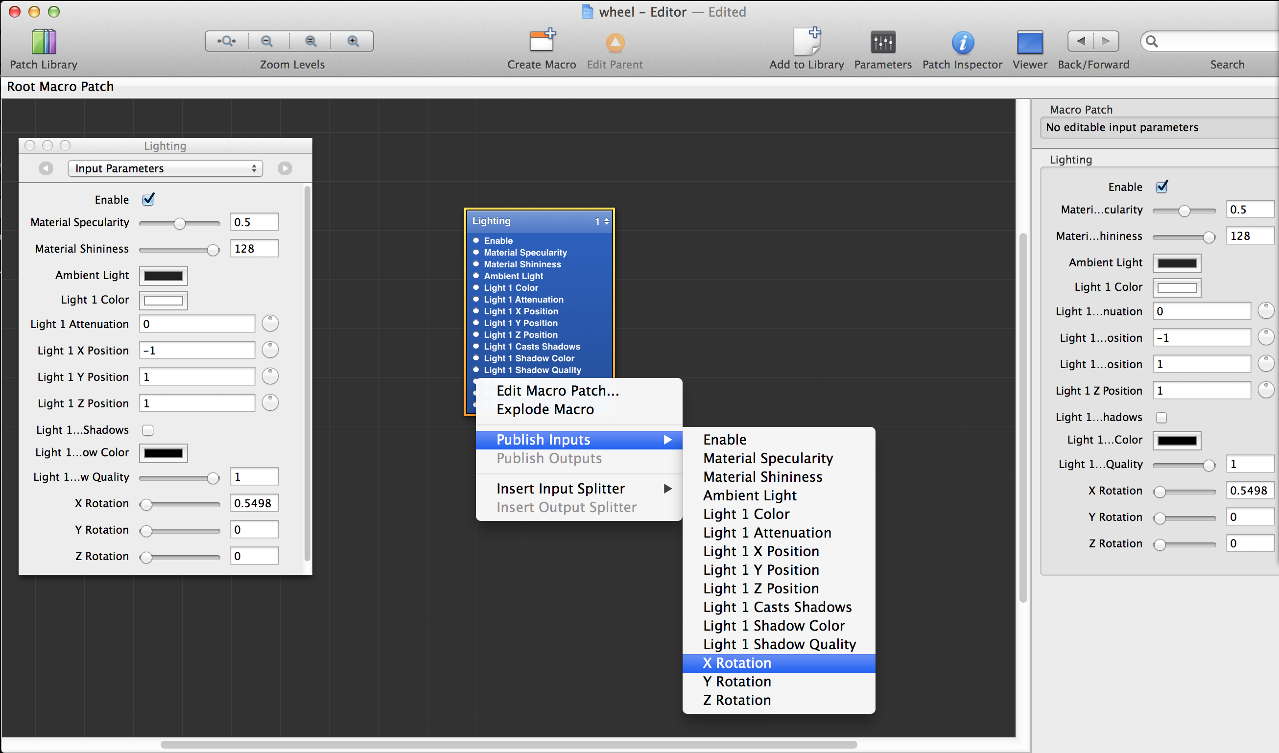 Since my Quartz composition is in a lighting effect, you need to go to the Parent directory and publish the inputs you want Resolume to see.