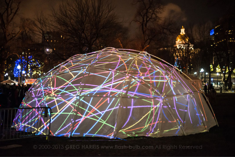 NYE Boston - the Video Bleep team helped ring in the New Year by setting up an immersive video dome with 3 edge-blended projectors. Visuals courtesy of a Hackintosh running Resolume, with a second computer running audio from Ableton and sending network MIDI sequences to the visual computer.