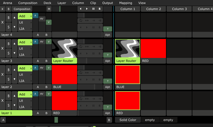 If you want to apply different effects to your clip in layer 1, all you have to do is use [Ignore Column Trigger] in Layer 1 and use the layer routers in layer 3 to make changes.