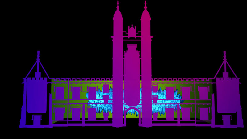 I want to use greyscale videos rather than alpha png masks so I can achieve a sense of depth on the buildings geometry as well as take advantage of changing lighting etc in the greyscale videos from a scene in C4D. I want video A to reveal resolume content on the foreground face of the building and video B to reveal resolume content on the background wall + I want to put another video layer in the middle so it looks like an object is in the room.