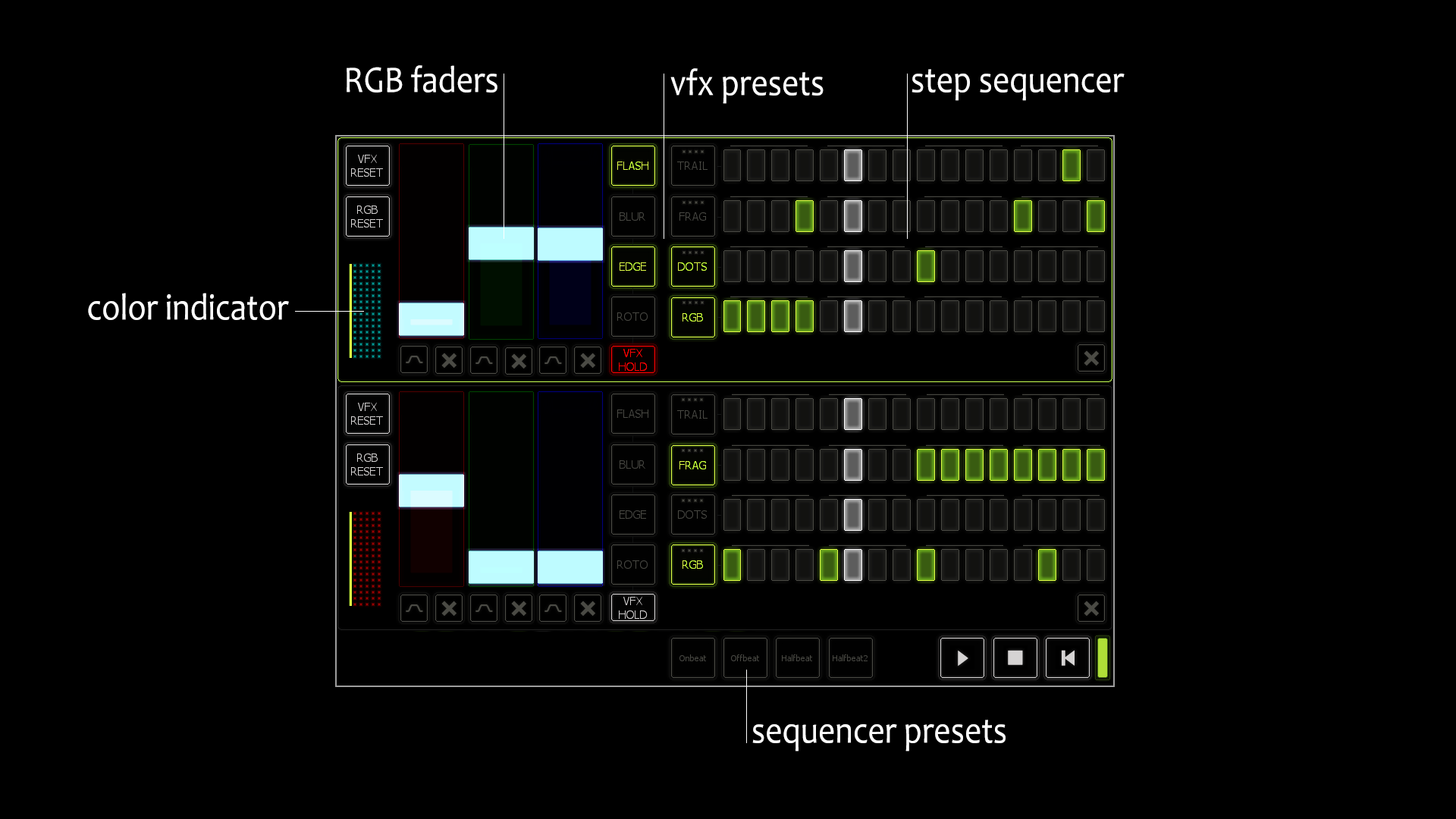 Hold in mind that this sequencer only triggers fx on layer 2 & 3 but with a bit of Lemur knowledge you will be able to extend or reconfigure this setup.