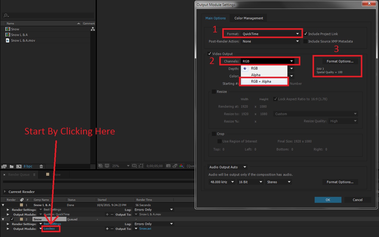 Just in case others are wondering what I did in Adobe After Effects (that was not in others), see my Render Cue settings below