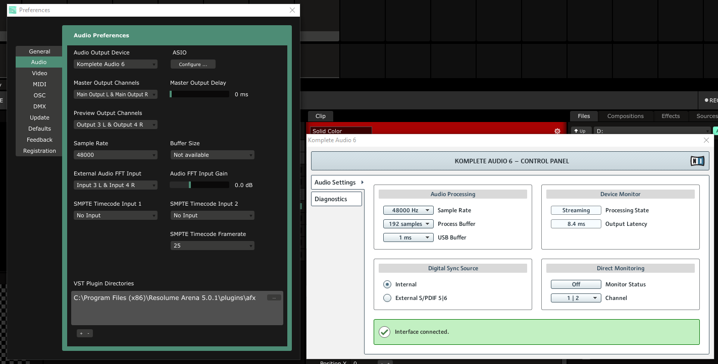I am using a NI Komplete Audio 6 on Windows. I was wondering, is the smoother output image due to there being better chips/converters in the interface, or a lower latency ASIO driver?: Resolume uses ASIO to use the interface. As seen in the image below, the sample settings are controlled by the driver's utility and not through resolume.