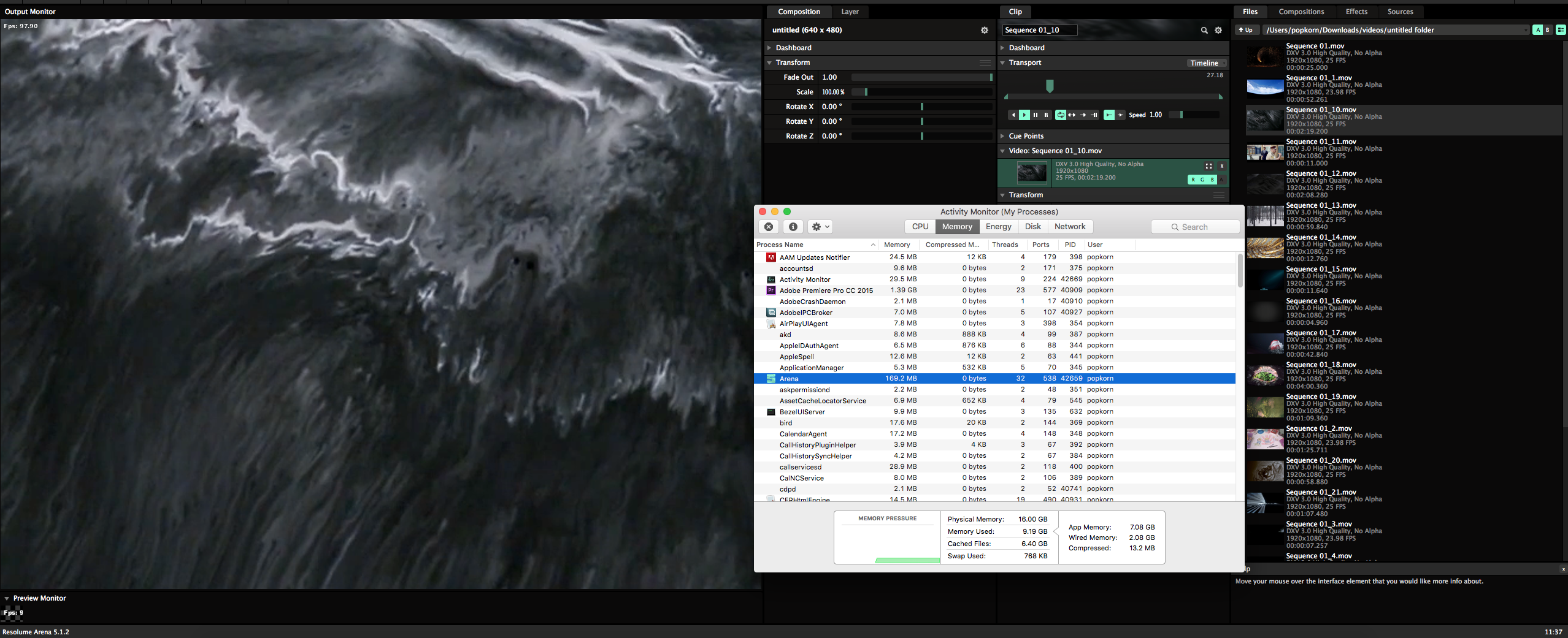 In the attached Image you will see that Arena (using a single 1080p clip coded in a DXV3 shell) is running 59.94fps and is using 169.2mb of physical memory. When your application memory poll hits around 2.5-3GB you will get a low memory error in red at the bottom of your GUI. So even though you have 10GB you are only allotted 4GB for Arena.
