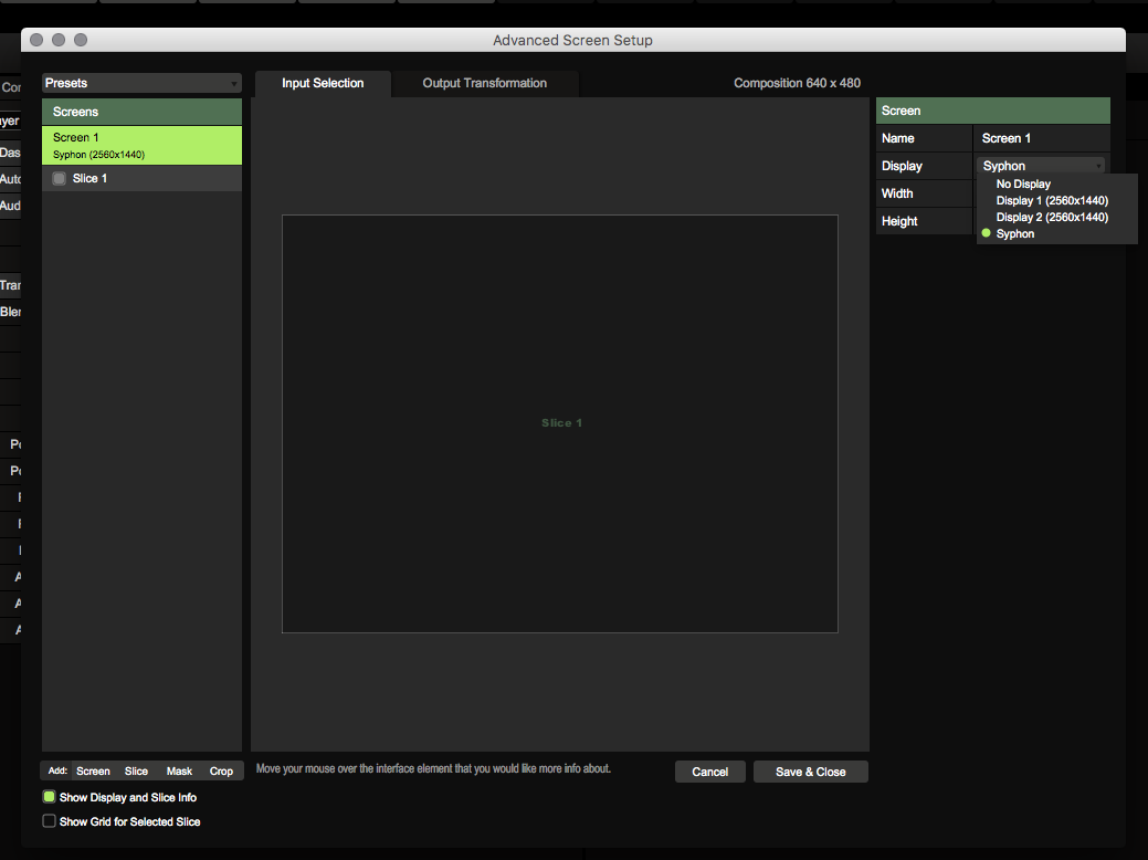 If you want to send out the Advanced Output as well, you can select Syphon as a destination for the screen you want to send out. Then this will show up as Syphon Server with the name you have given the screen in the Advanced Output.