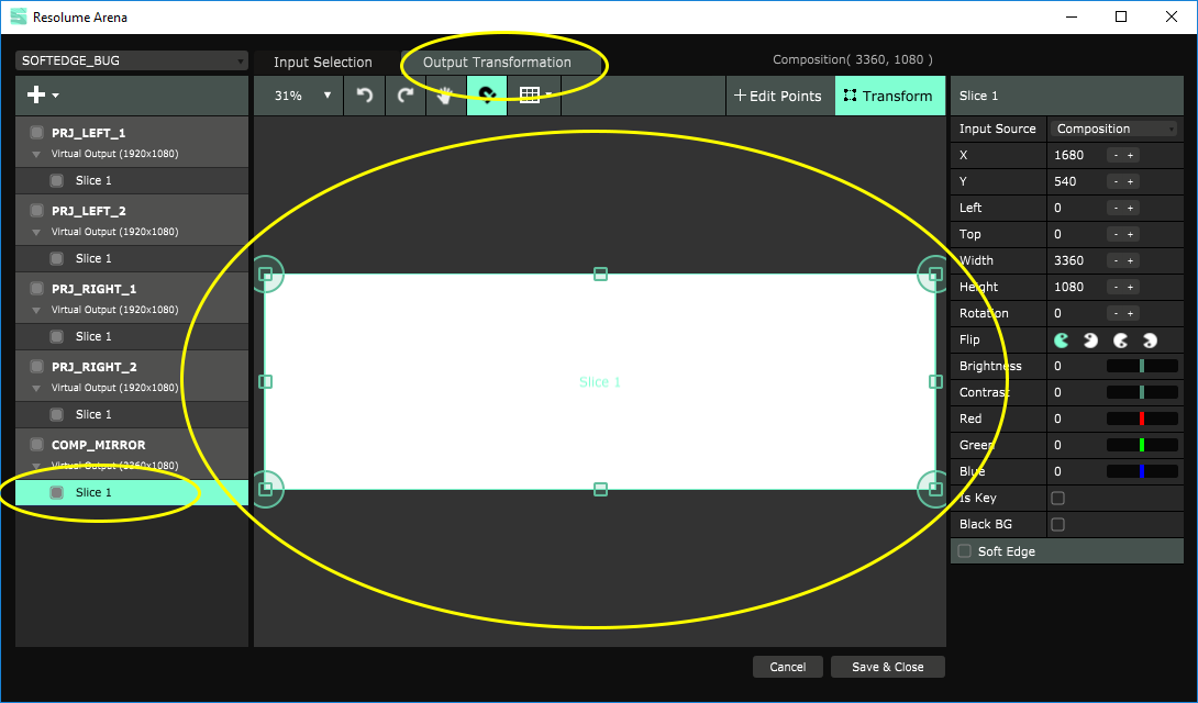 - set up the first projector of the "left stack", with only one slice and "composition" as input source. Don't forget to turn on "Soft Edge" checkbox
