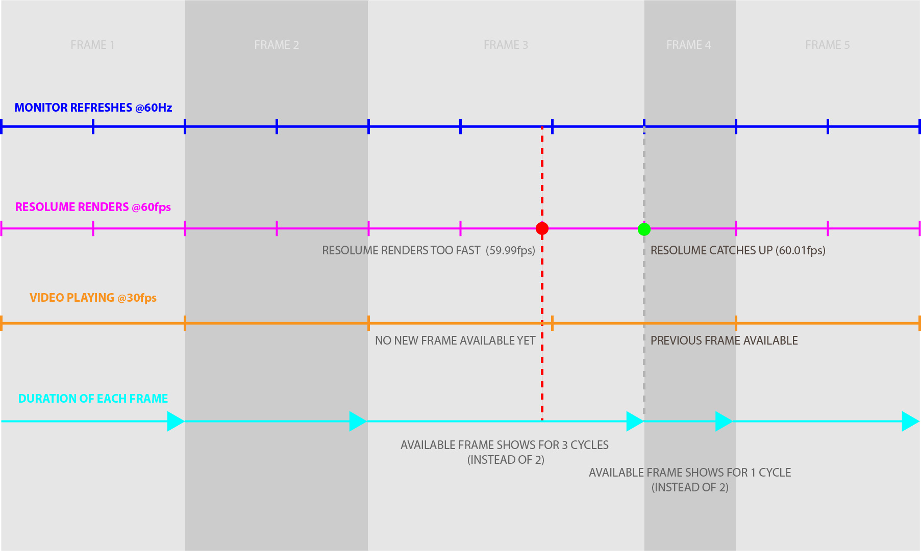 Joris, thanks for the detailed explanation. In your diagram, what would be the reason why Resolume would render too fast which would result in having to hold a frame for an extra cycle and skip one cycle for the next one?