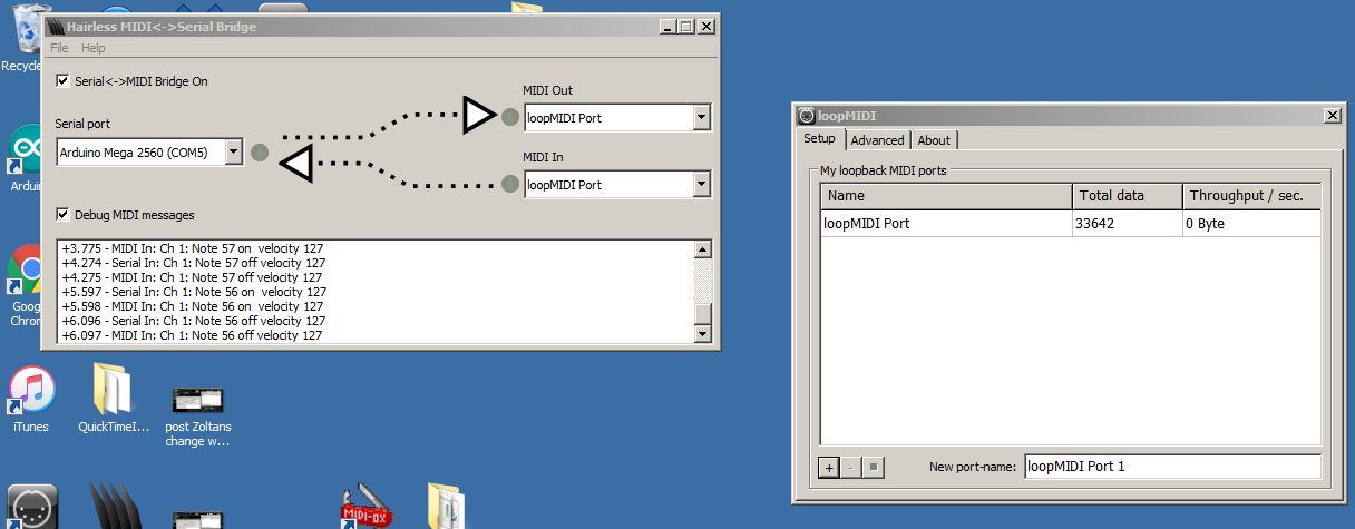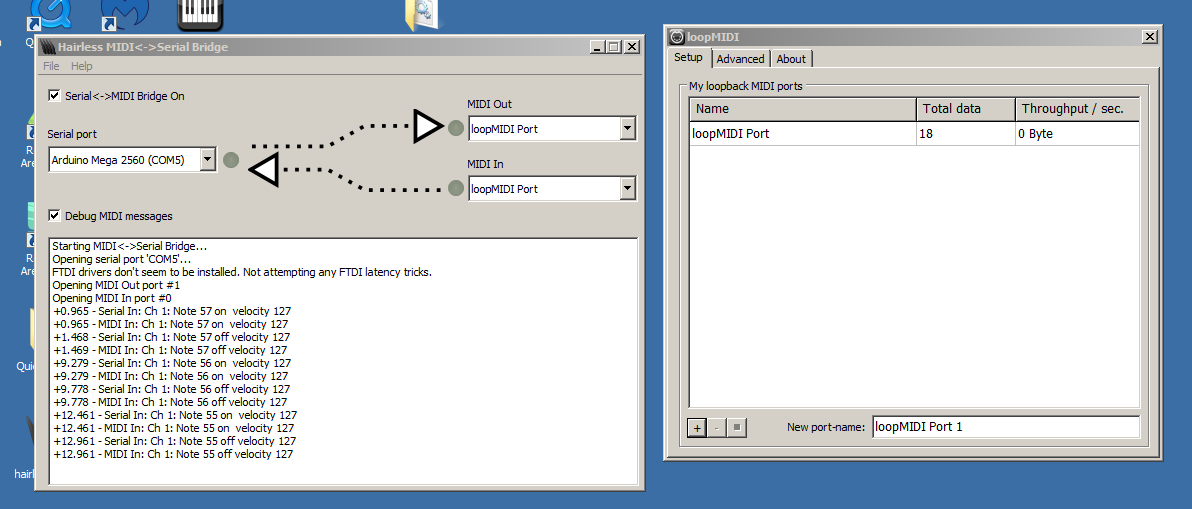 So the way the arduino code works is like this, loopmidi has made the virtual midi port, hairless midi is attached to that same port, then finally resolume is set to see that virtual port too. When the arduino code starts, it checks to see if the sensors give an answer that's above a certain threshold, if the answer is yes, then +1 gets added to 'newnote'. Later in the code (when I'm constructing the midi packet), I tell it to send out a note based on that 'newnote' variable.