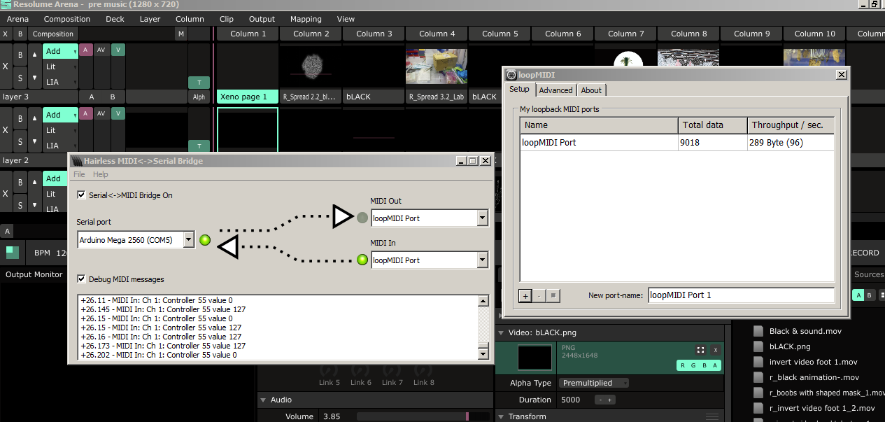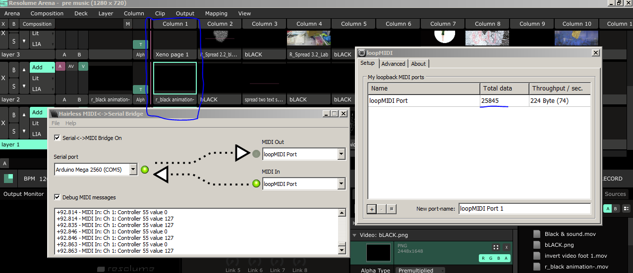 I'm using windows 7 and have tried to set everything up in Arena 4.1.8 & 5.1.4. Everything's been edited with Media Encoder to the dxv standard through the adobe suite, I've tried 38400 baud and 115200. I've tried opening hairless before and after resolume is open. Even holding the arduino's reset button so that I'm certain resolume 'hears' the status byte at the start of the transmission.