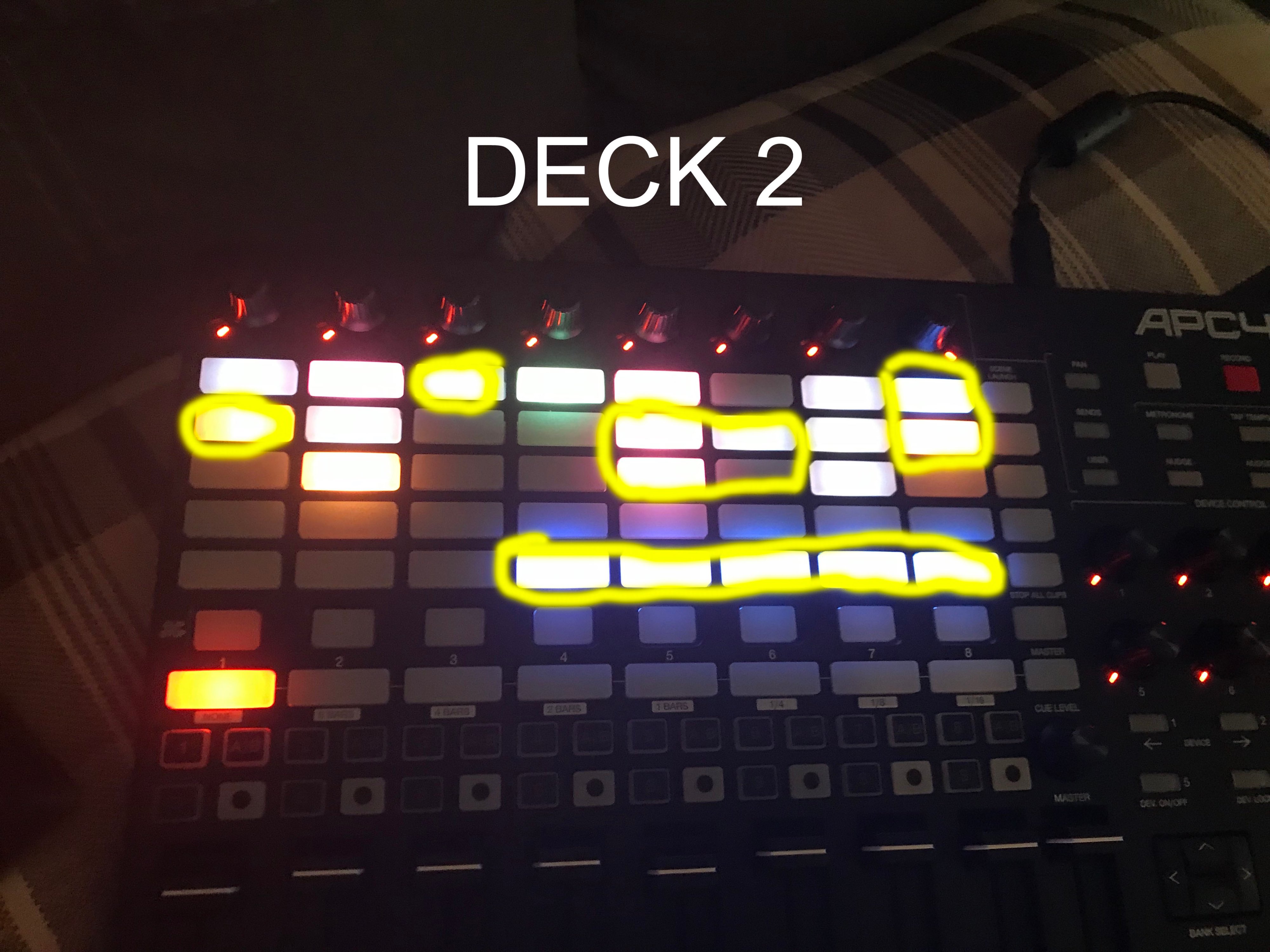 Everything circled in yellow on deck 2 is a light from deck 1 that stays on when I switch to deck 2 and change the MIDI shortcuts to the ones programmed for deck 2.