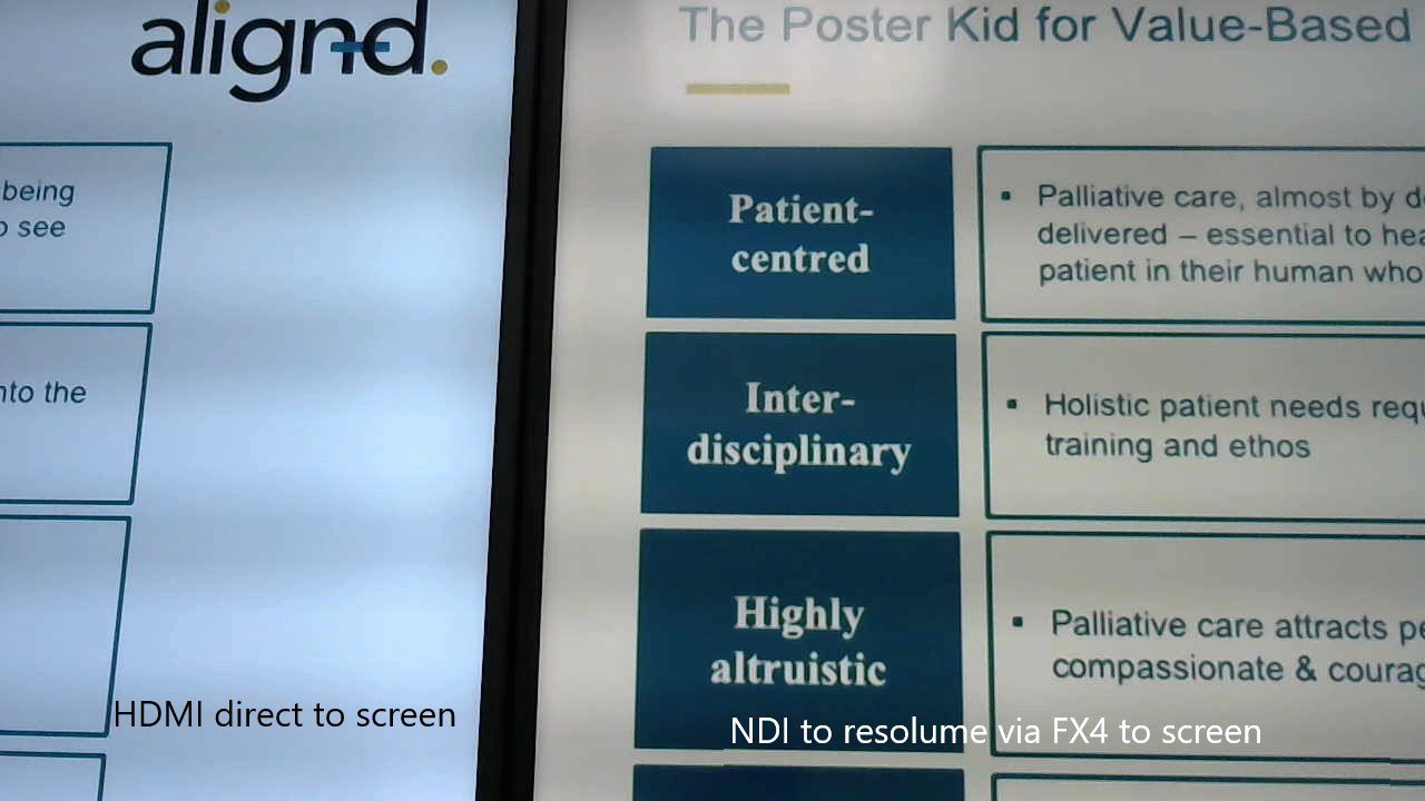I am busy prepping for a corporate event with a triple 1920x1080 screen setup. We will run 3 Christie LHD720i projectors(for testing we are using 03xHisense 50'' screens in the office). PPT will be displayed on the 2 outer screens and relay to screen on the center screen. I have created a 5760x1080 composition in Resolume. I have setup custom (5760x1080 60hz 32bit progressive CVT reduced blank)resolution in NVIDIA control panel. I am running display port from Gtx1070 to Fx4, Fx4 setup with 03 x1920x1080 60hz screens and input 5760x1080 60hz. I am running NDi signal from both Mac & Windows PC into TP-Link 16 port Gigabit switch) and into Resolume server respectively. All the connections are present and i receive the respective signals into Resolume. However the quality of the ndi screen in Resolume seems fuzzy compared to signal directly from HDMI into screen. If i run any footage from server direct then output images sharp. It almsot apear as if NDi out is out of focus. Not sure is this make sense.