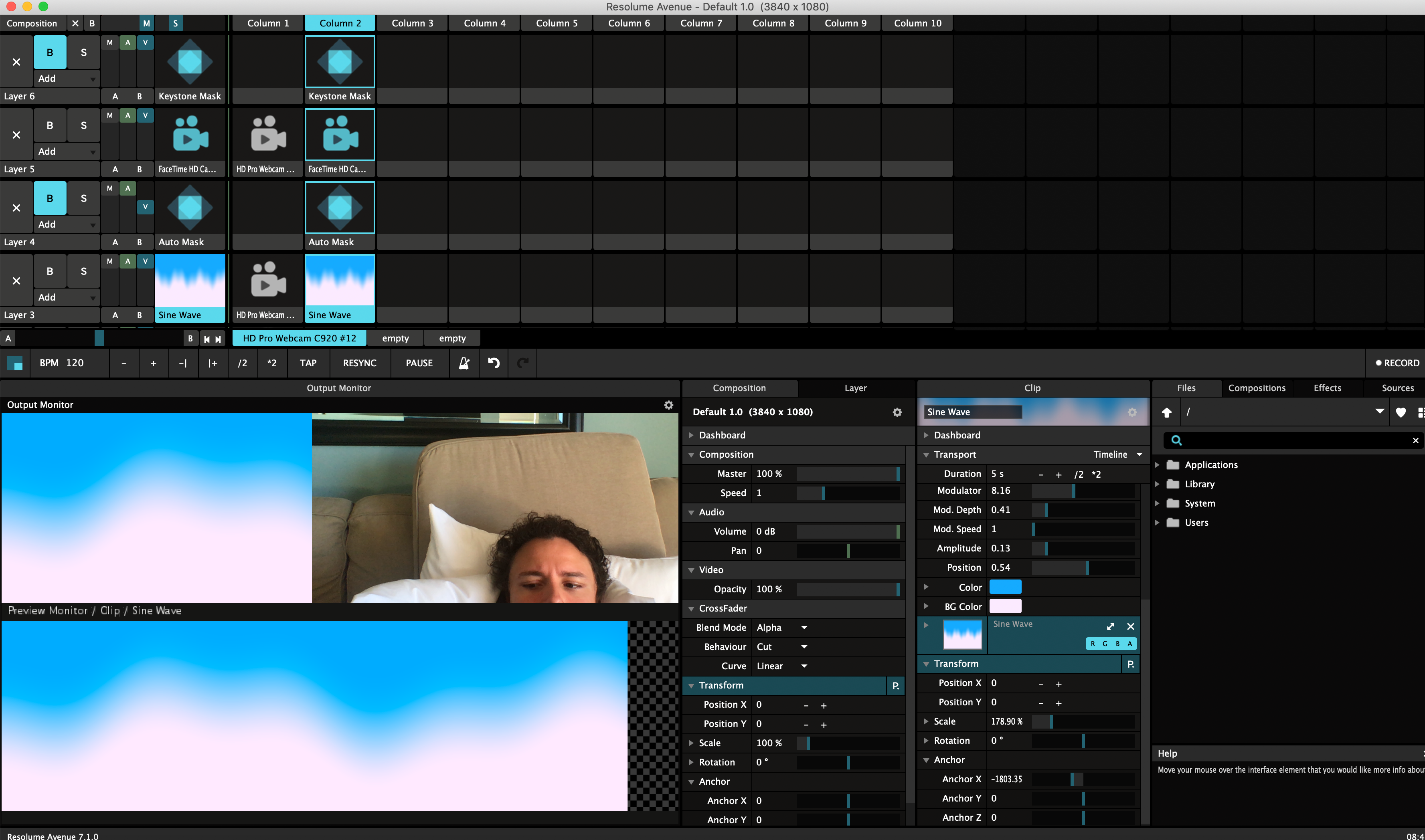 In my setup, all my clips for the different layers are in the same column. They are in the same column because only the clips that are in the selected column show up in the composition. if I put the clips for each side in separate columns, then only one side shows up at a time depending on which column is selected.