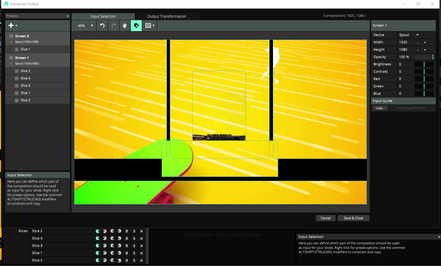 I'm still familiarizing myself with the concept of screens and slices, but I got my 5 slices under one "screen" projecting the actual background image, and then I have another "screen" with a single slice, being my camera. I created a group with the layers that I would use for the background videos, and applied slice transform to that group. On a separate layer i have my cam input, and that one also has a slice transform.