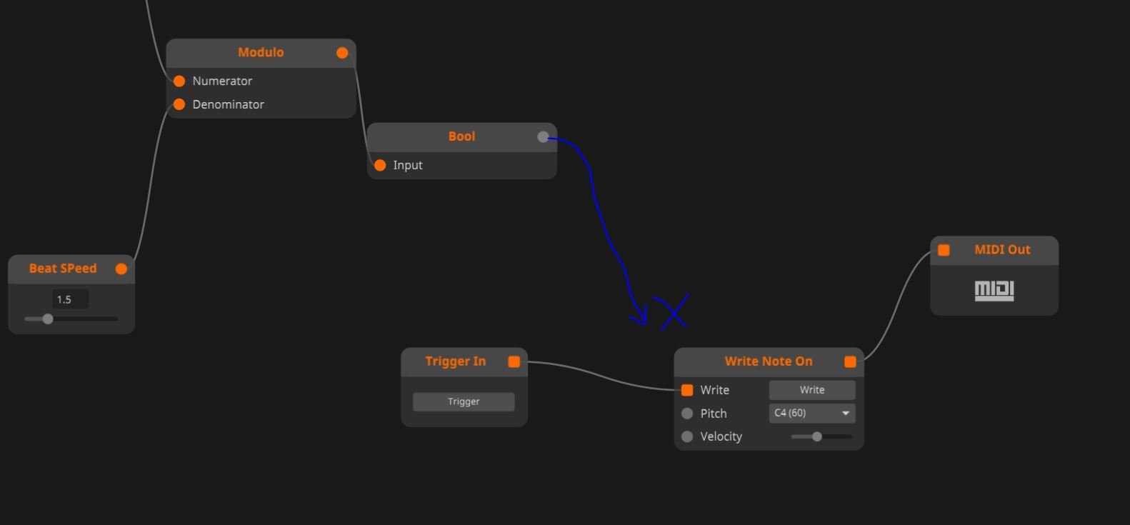 I have a generator that counts up and is MOD of an input. This generates a TRUE ever so often, kind of like an oscillator. I have tried everything possible, but can not connect it to the trigger of a MIDI WRITE module.