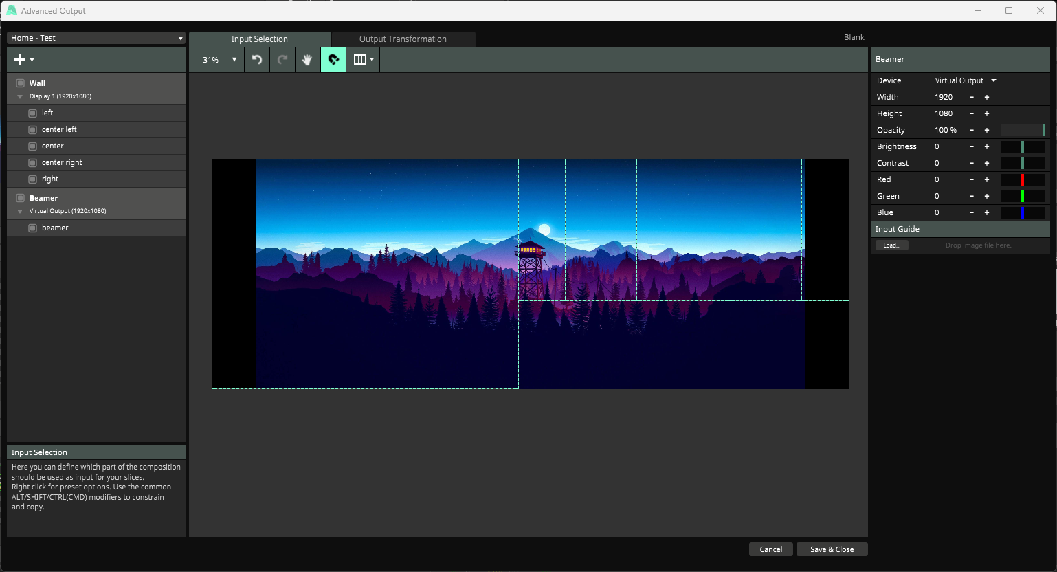 I want to use features like auto resize relating to the LED-Screen Output (the five Slices) but it will do it relating to the whole composition. As I want to use mask, i can't use fit or fill in the Slice Transform Menue.