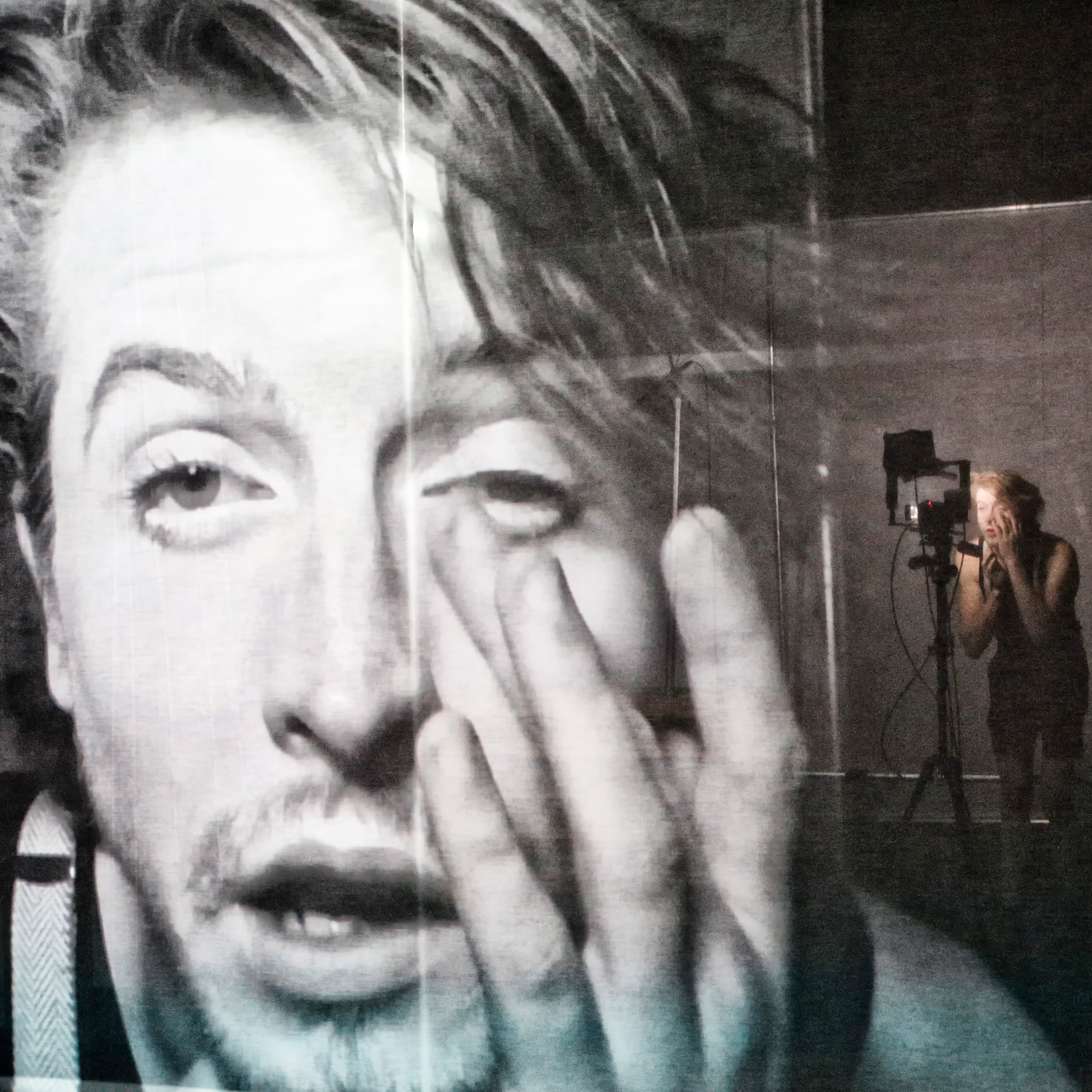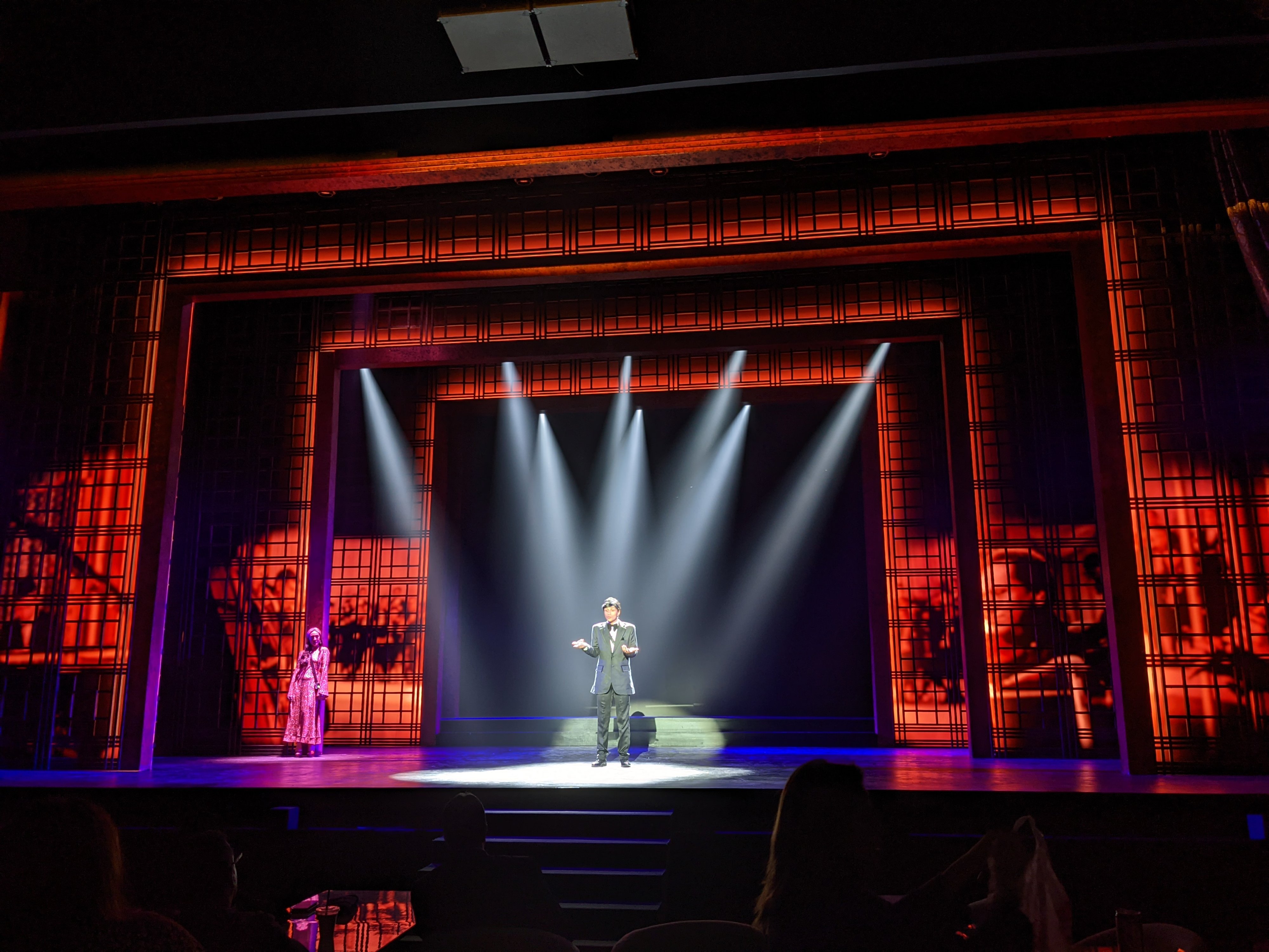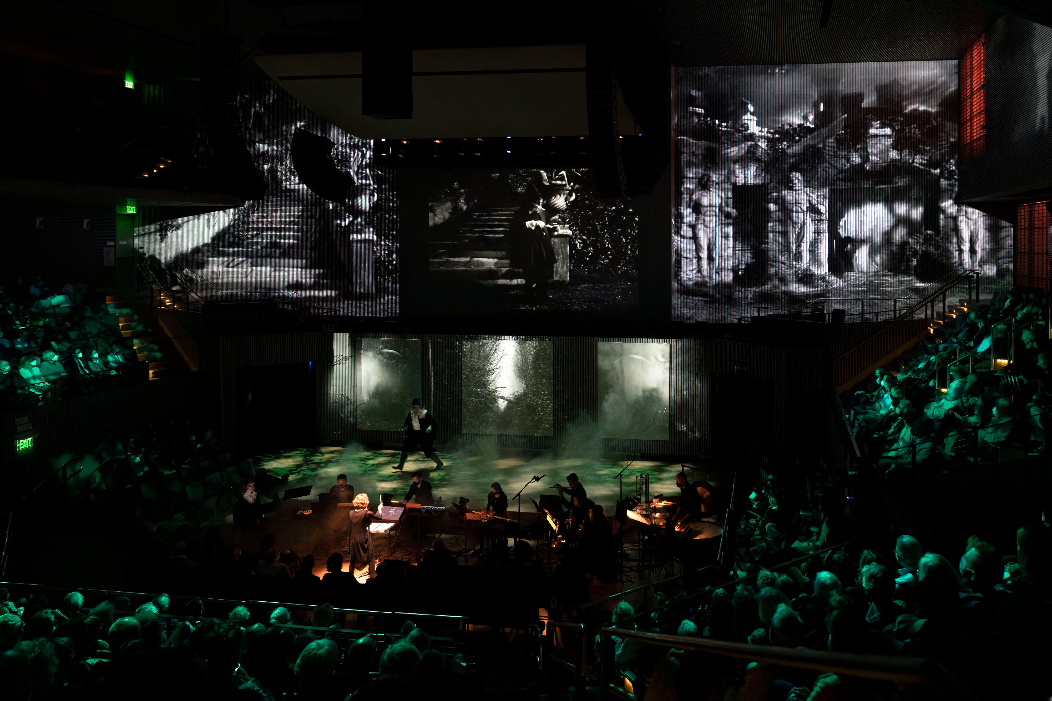 2x Panasonic PT-RZ21K at a 45 degree for coverage for the supertitle screen and TAIT automated panels (Gerriets Grey Sharkstooth Scrim), tracked via OSC.