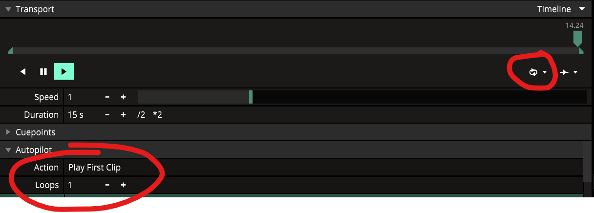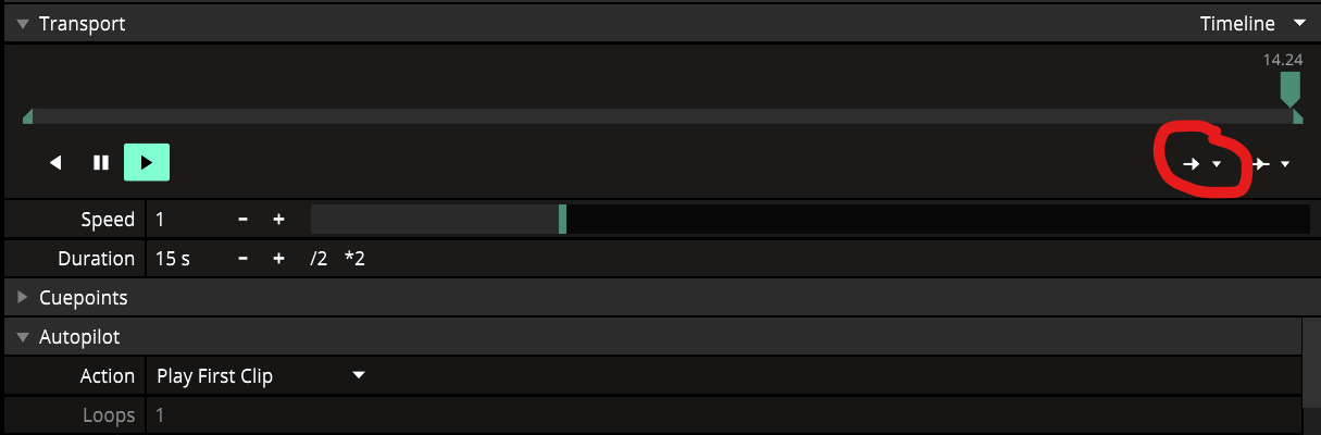 At this point Clip 2 does play after clip 1, however when I retrigger clip 1 (which is 15 seconds long) it has stopped playing at 14:24, rather than the end of the clip and does not retrigger.