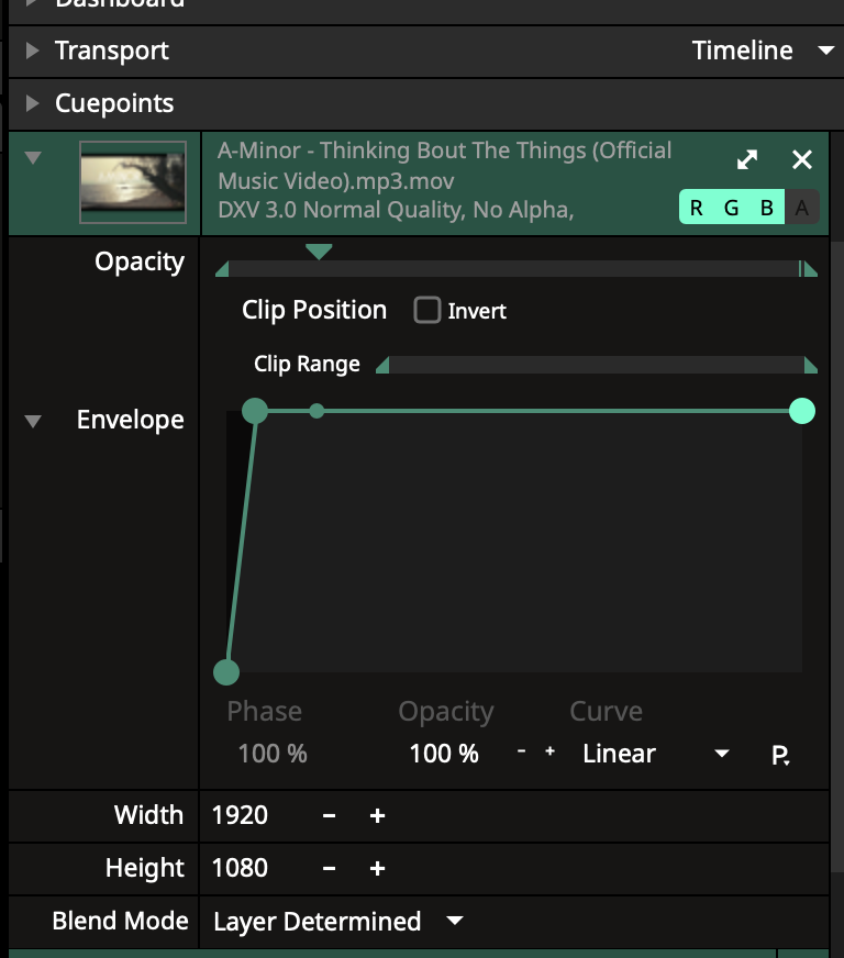 DXV3 clip. Opacity with envelope set at "Clip Position" to make a 3 sec fade in.