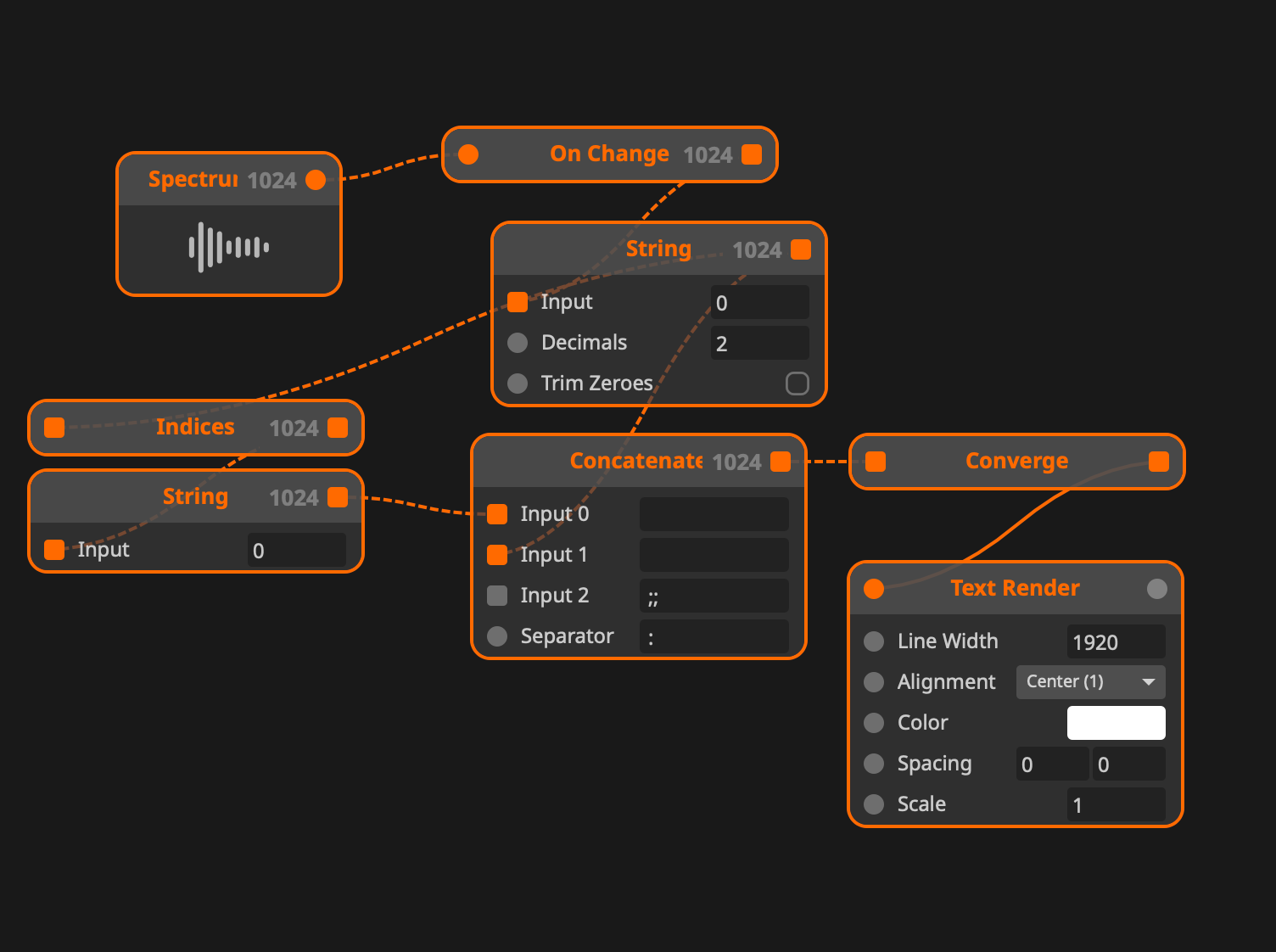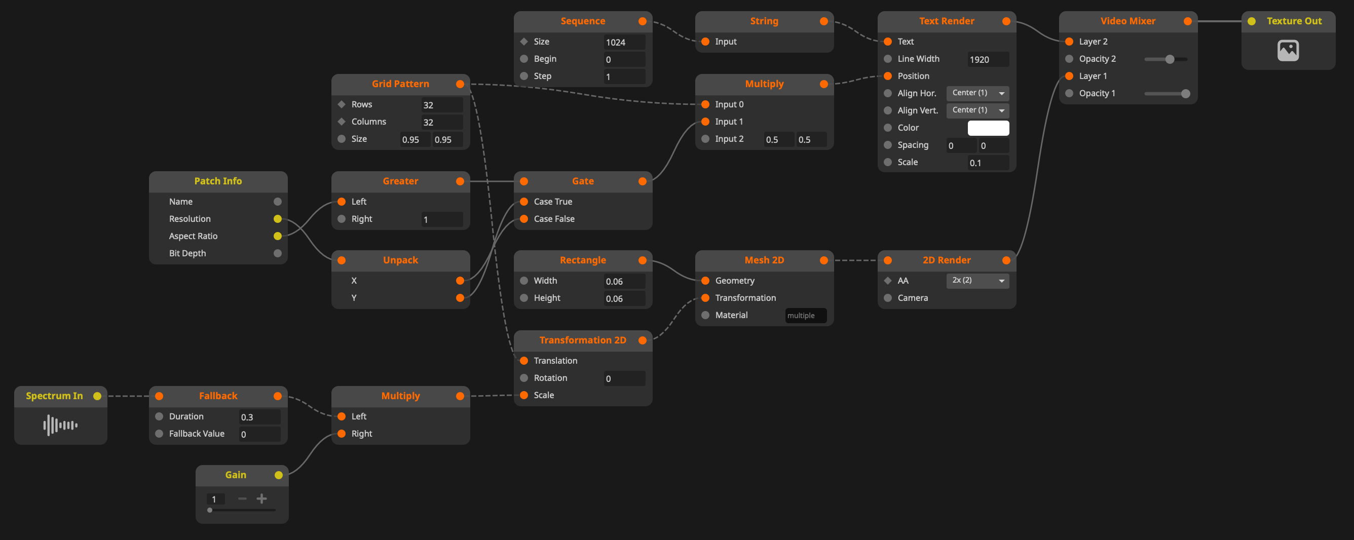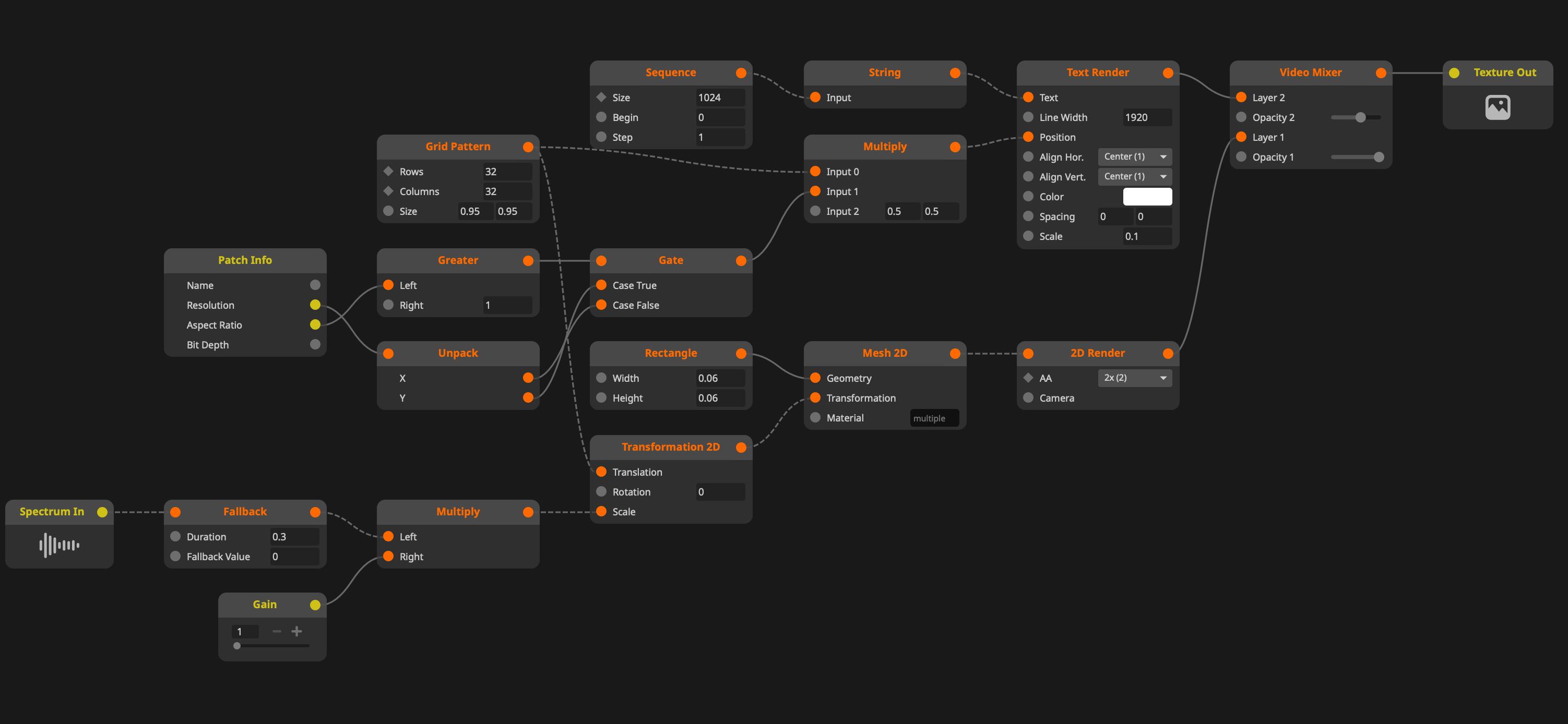 Spectrum input loaded in Wire, doesn't give a changing signal at this time. We know this makes making FFT patches not really easy, and have a ticket to give a sample FFT signal for the patch debug.